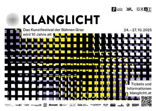 10 JAHRE KLANGLICHT – Das Kunstfestival der Bühnen Graz 4 Abende Licht- und Klangkunst von 24. bis 27. Oktober 2025, täglich von 18:00 bis 23:00 Uhr in der Grazer Innenstadt. An 16 Standorten - darunter Stadtpfarrkirche, Mausoleum und Dreifaltigkeitskirche - laden KLANGLICHT-Installationen ein, die gewohnte Umgebung in einem neuen Licht zu entdecken.