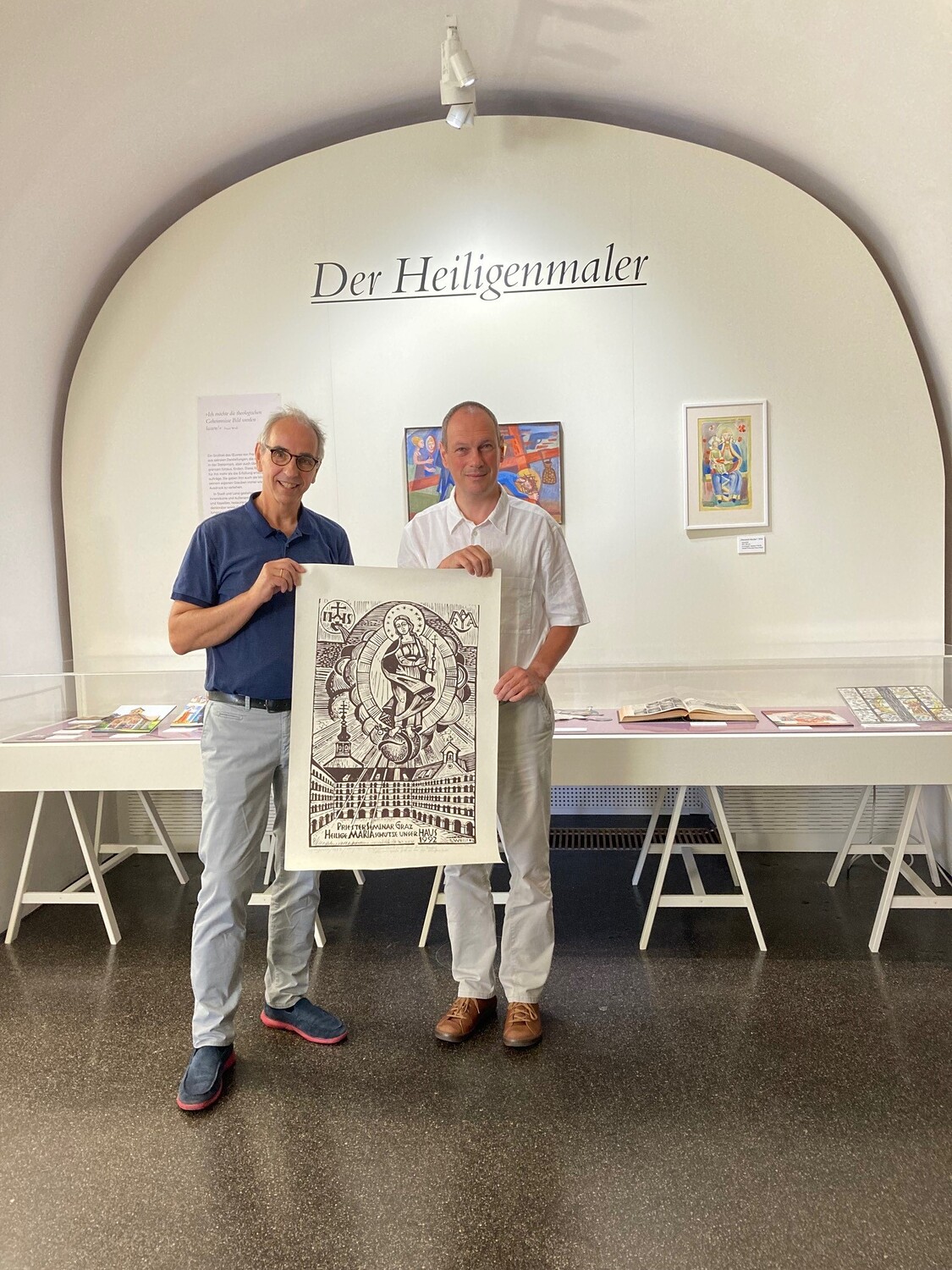 „Es wäre wirklich eine große Freude, wenn ich ein Blatt dieses Holzschnittes bekommen könnte", sprach Stadtpfarrpropst Pristavec seinen Wunsch bei der Ausstellungseröffnung aus. Und am 31. Juli 2024 war es soweit und ein Abzug des besagten Holzschnittes konnte dank Recherche von Kuratorin Dr.in Monika Primas in den Ausstellungsräumlichkeiten der Steiermärkischen Landesbibliothek übergeben werden.