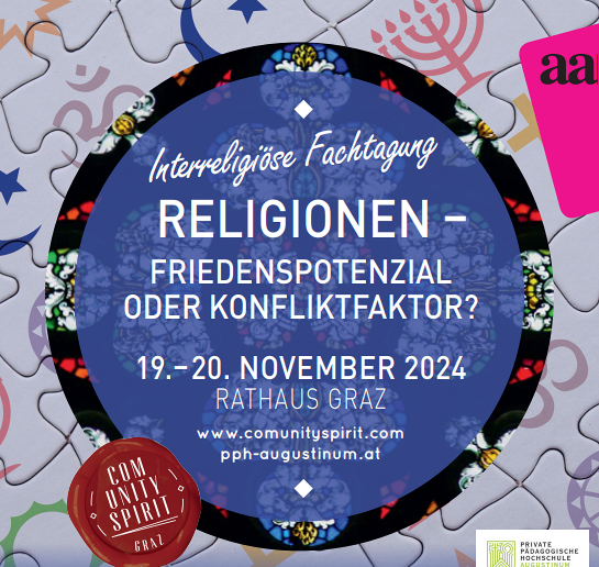 ComUnitySpirit – ein Projekt des Afro-Asiatischen Institut Graz – lädt in Kooperation mit der Privaten Pädagogischen Hochschule Augustinum zur interreligiösen Fachtagung mit dem Titel „Religionen – Friedenspotenzial oder Konfliktfaktor“ am 19. und 20. November 2024 im Grazer Rathaus ein.