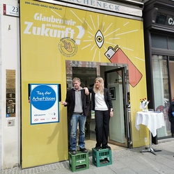 Die Schauspielerin Tatiana Wolf und der Schauspieler Andreas M.E. Hierzer brachten Zitate Arbeitsuchender sowie Passagen aus der katholischen Soziallehre und Schriften der Gewerkschaft zu Gehör, um auf die Situation Arbeitsuchender aufmerksam zu machen.