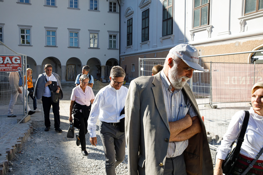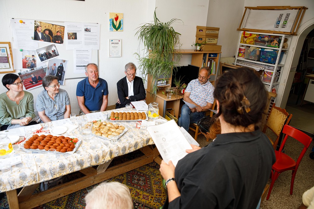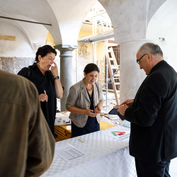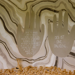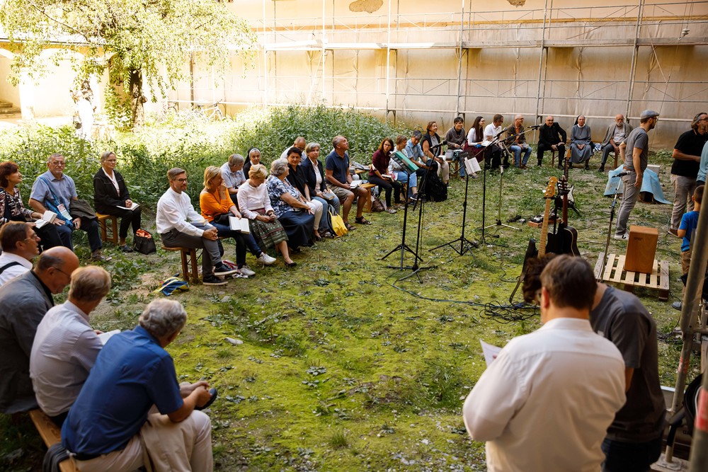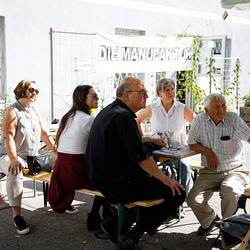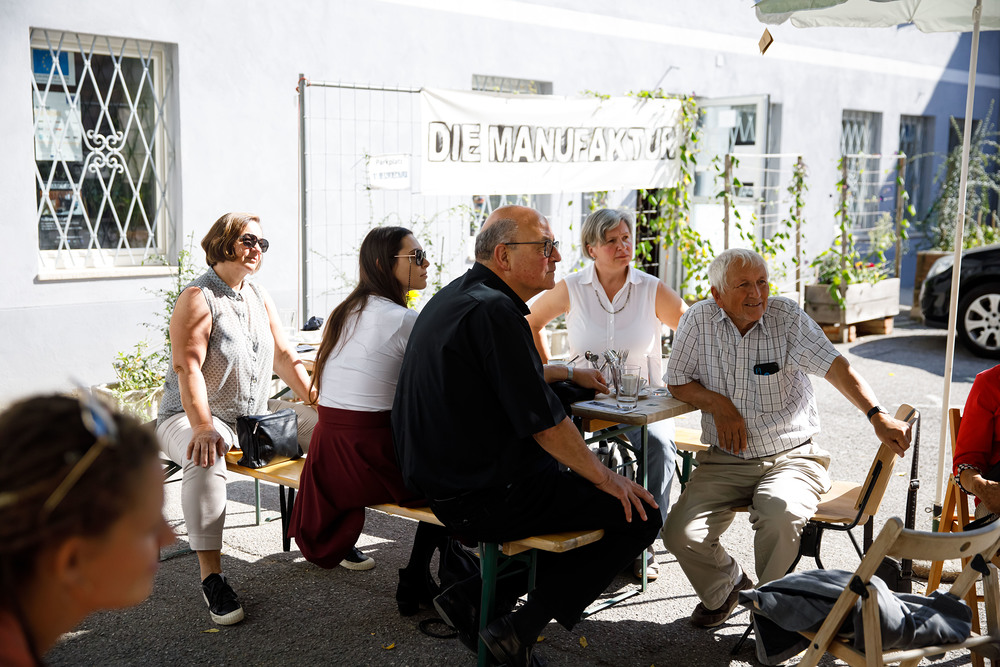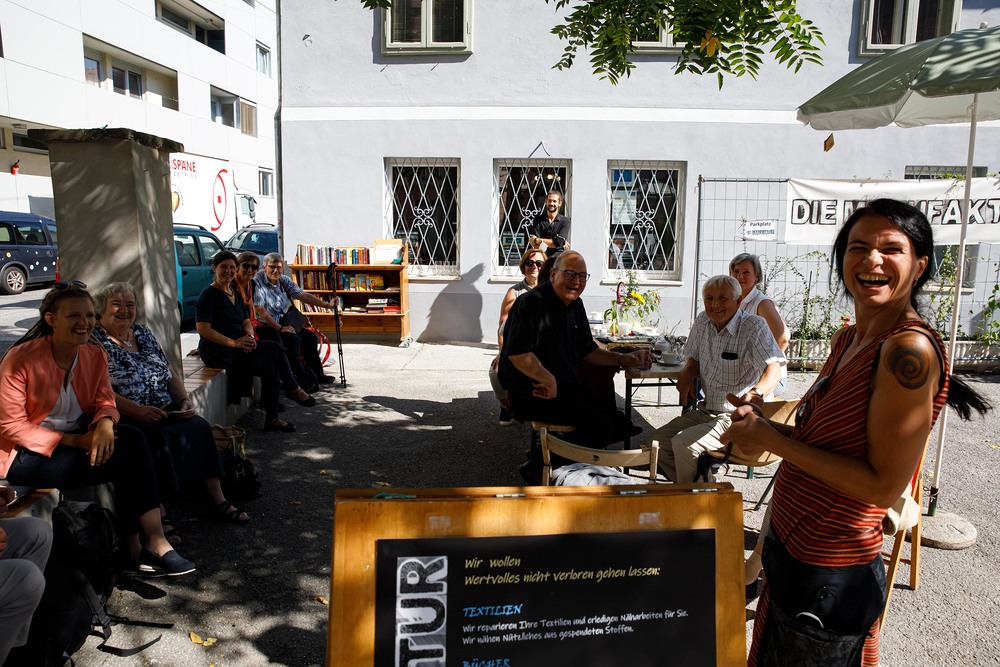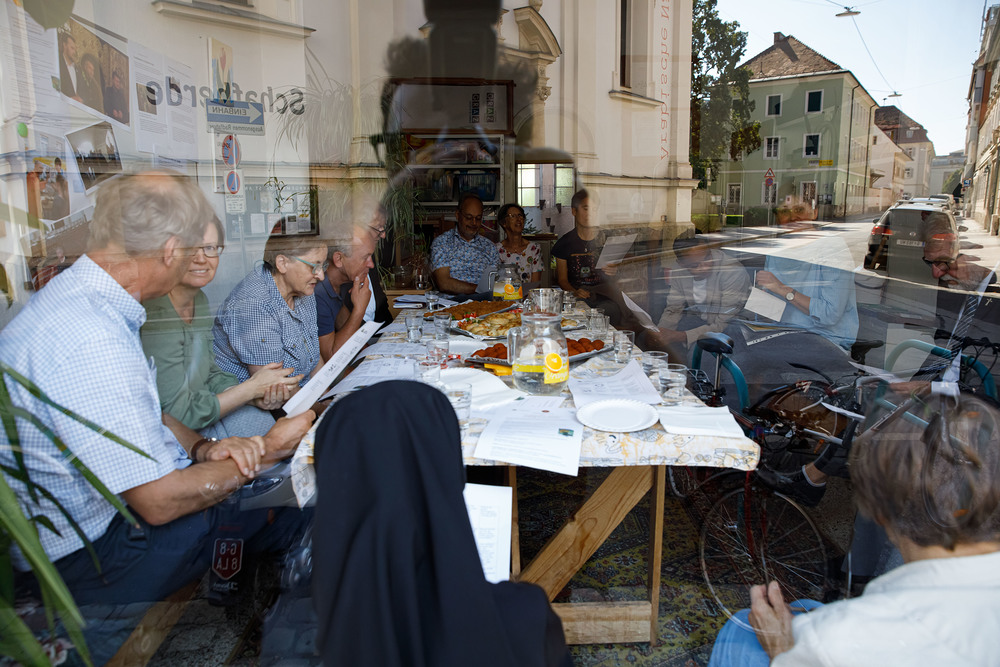 Der Weg führte die MitGEHenden dann hinaus an drei Orte: zur erwähnten „Schule des WIR“, einem Kunstprojekt des Grazer Kulturjahres, zum Verein „Die Manufaktur“, einem Beschäftigungs- und Upcyclingprojekt, sowie zum „Büro der Nachbarschaften“ und ihren interreligiösen Bemühungen. Ein Teil der Gruppe besuchte schließlich das „Kircheneck“ als citypastoralen Ort. Der Schriftsteller Anton Christian Glatz bezeichnete das Kircheneck treffend als Ort mit Schanierfunktion („Zwischenort“) zwischen Sakralem und Profanen, wo auch Andersdenkende (wie auch er als Atheist) ihren Platz haben und niveauvoller Austausch, aber auch positive Streitgespräche möglich sind.