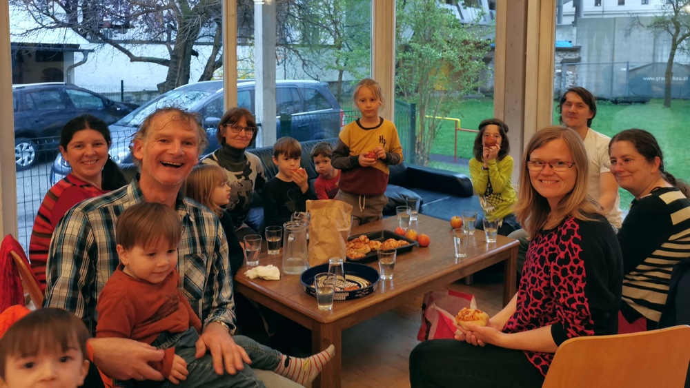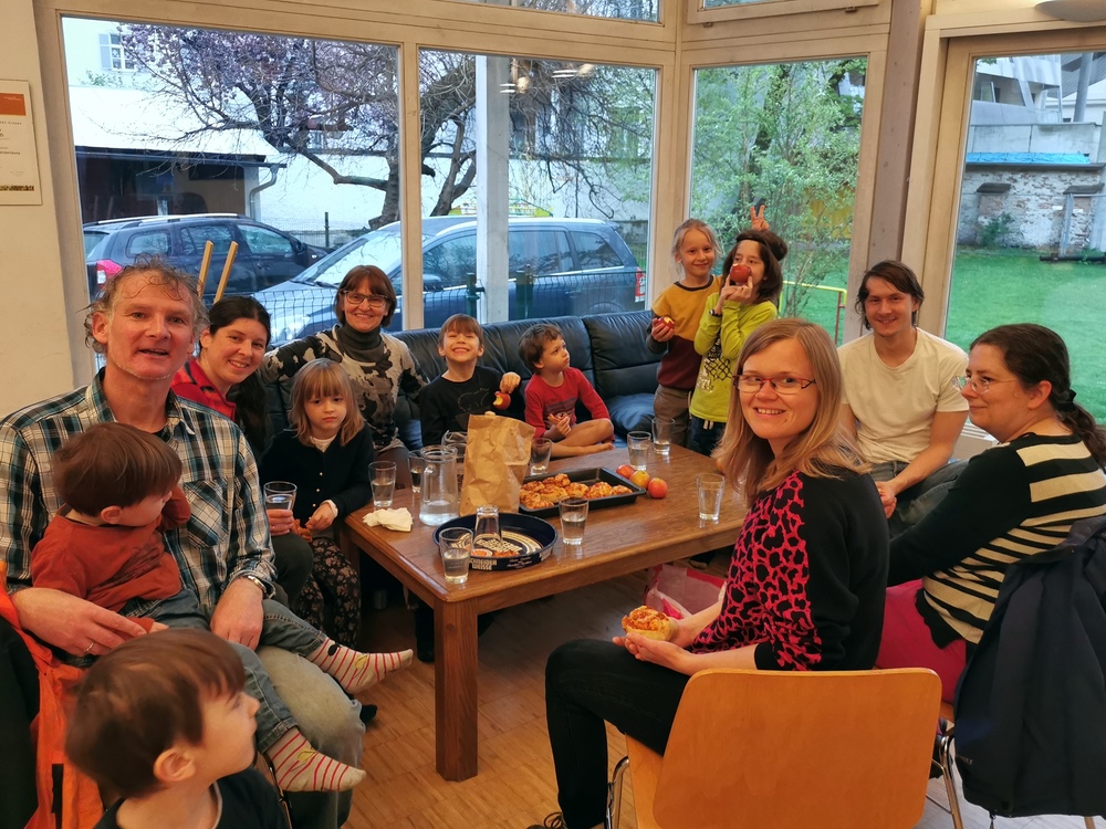 Im Pfarrsaal der Andräpfarre gab es eine köstliche "ZeroWaste" Bio-Jause mit Pizzaschnecken, Äpfel und selbstgemachten Holunder-Saft. Außerdem wurden eifrig die Müllsammel-Erfahrungen ausgetauscht. Zum Beispiel half ein vorbeigehendes Kind spontan beim Müllsammeln mit zur Freude der anderen Kindern.