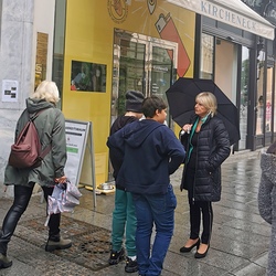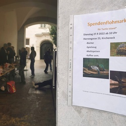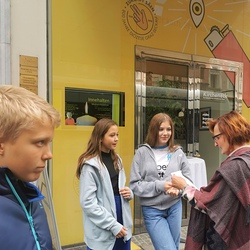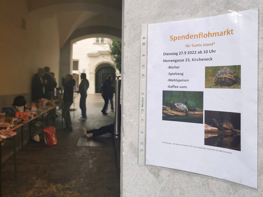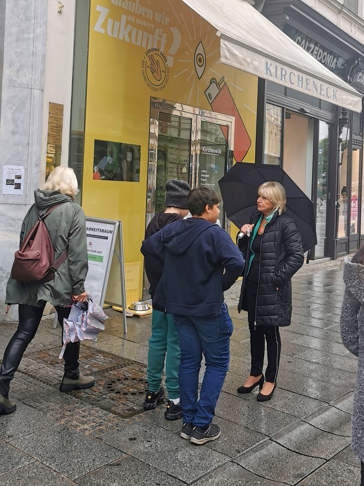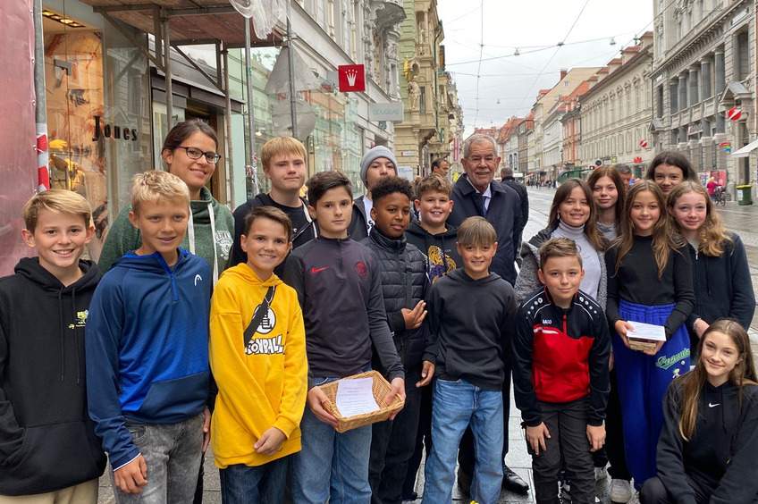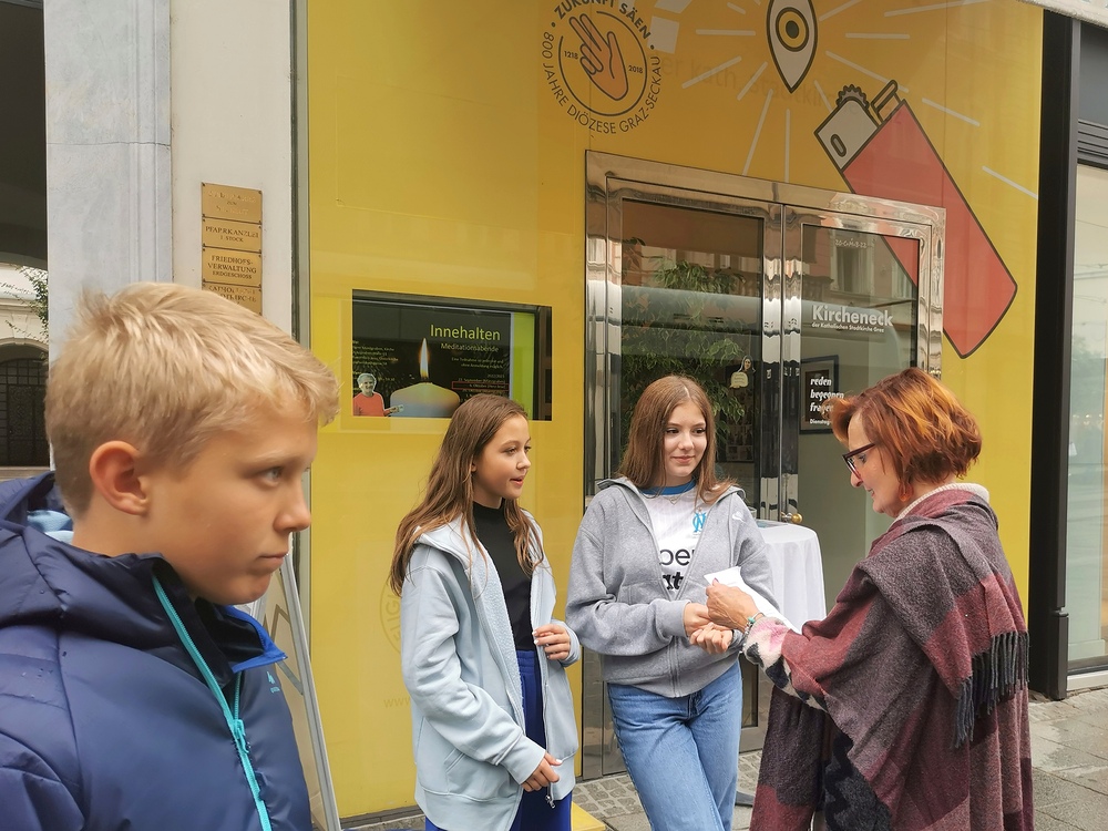 Schülerinnen und Schüler der HIB-Liebenau 3D mit Klassenlehrerin Anna Kirchmaier sammelten am 27. September beim Kircheneck in der Herrengasse für Turtle Island.