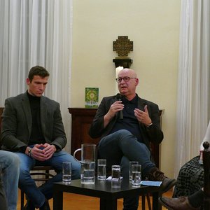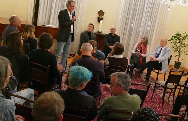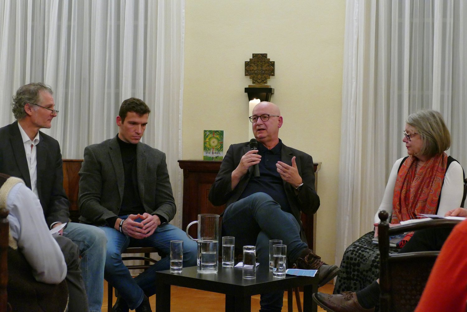 Im zweiten Teil wurde die Bibelstelle vom Jüngsten Gericht bei Matthäus 25 von Sabine Stering vorgelesen, die im Buch „Die fremde Gestalt“ in Kapitel 23 besprochen wird. Nun war jede und jeder eingeladen mit zu diskutieren, wie Theologe Florian Mittl berichtet, der neben Psychiater Michael Lehofer, Schriftsteller Anton Christian Glatz und Familienberaterin Sabine Stering am "Podium" war: