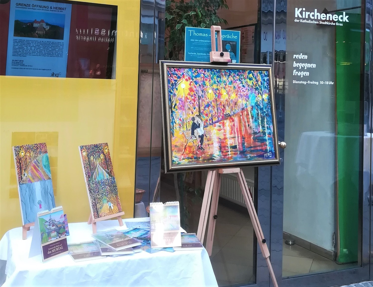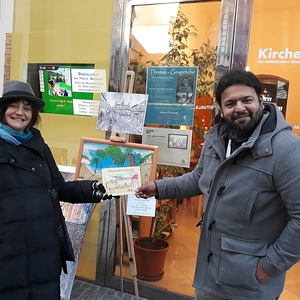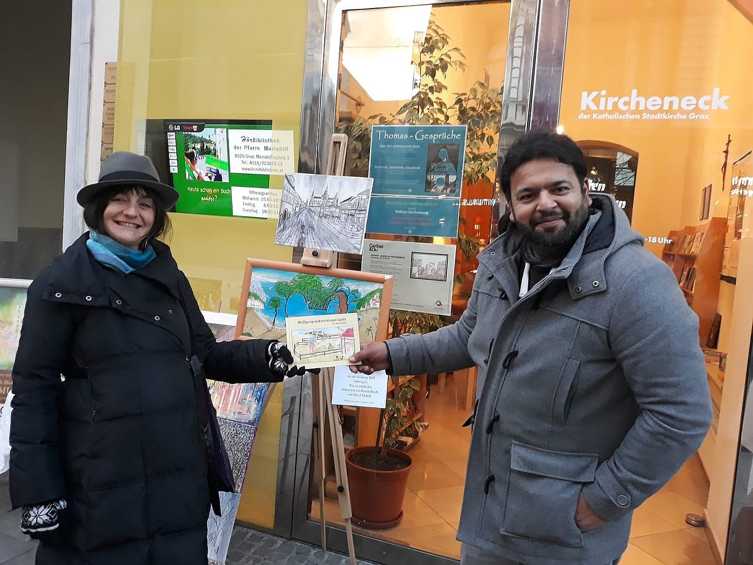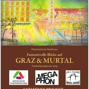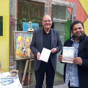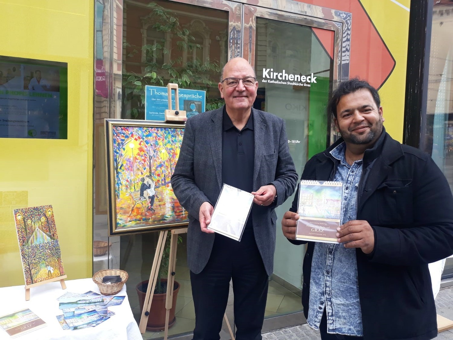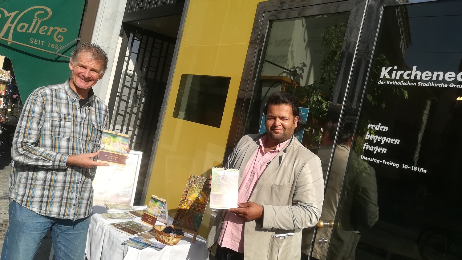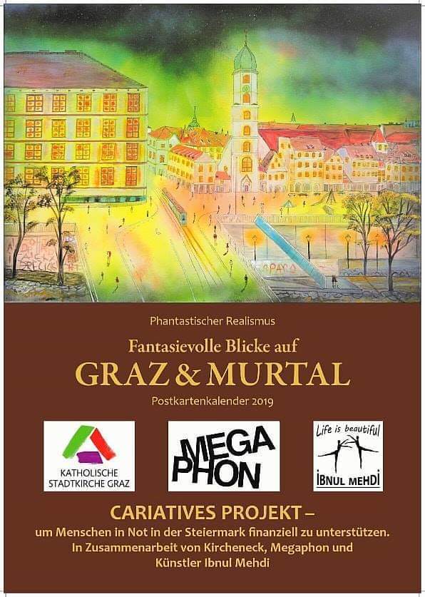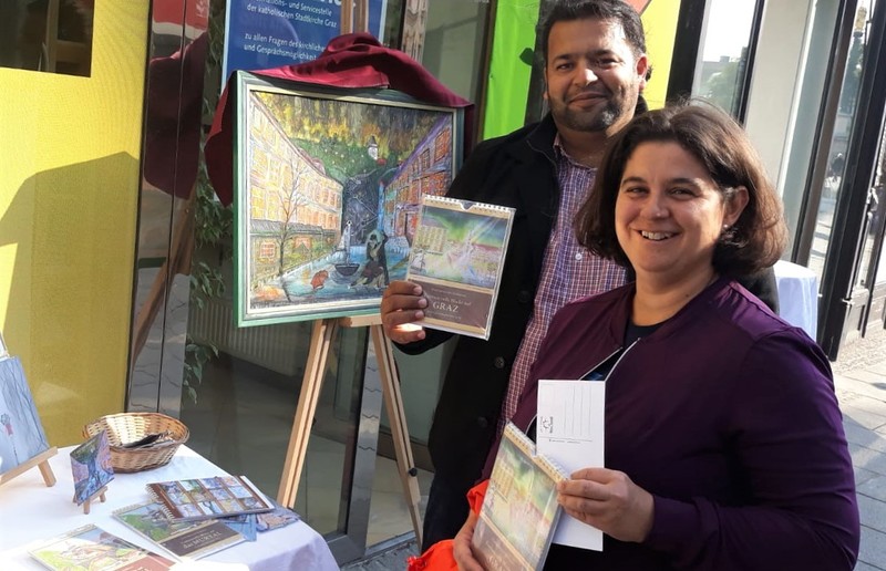 Der Kunstmaler IBNUL MEHDI aus Pakistan bietet Fotokalender seiner Ölbilder mit Motiven aus Graz und dem Murtal beim KIRCHENECK an. Ein Teil des Erlöses bekommt der MEGAPHON-Verein.