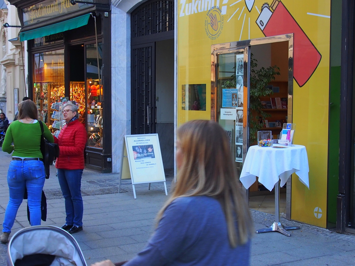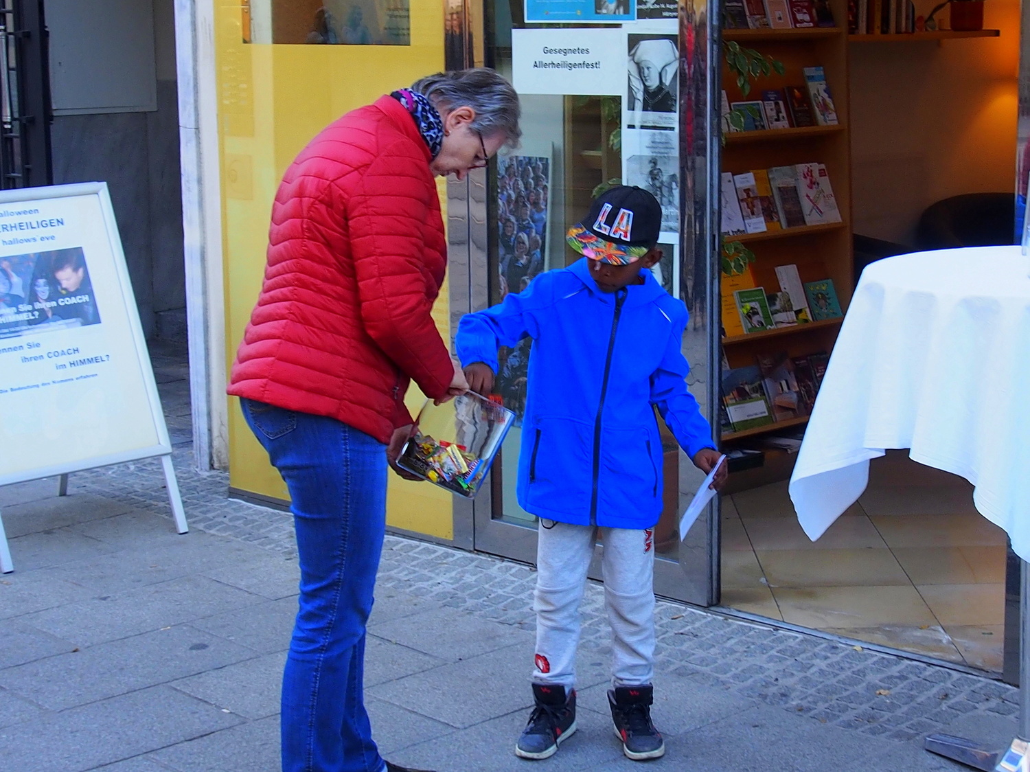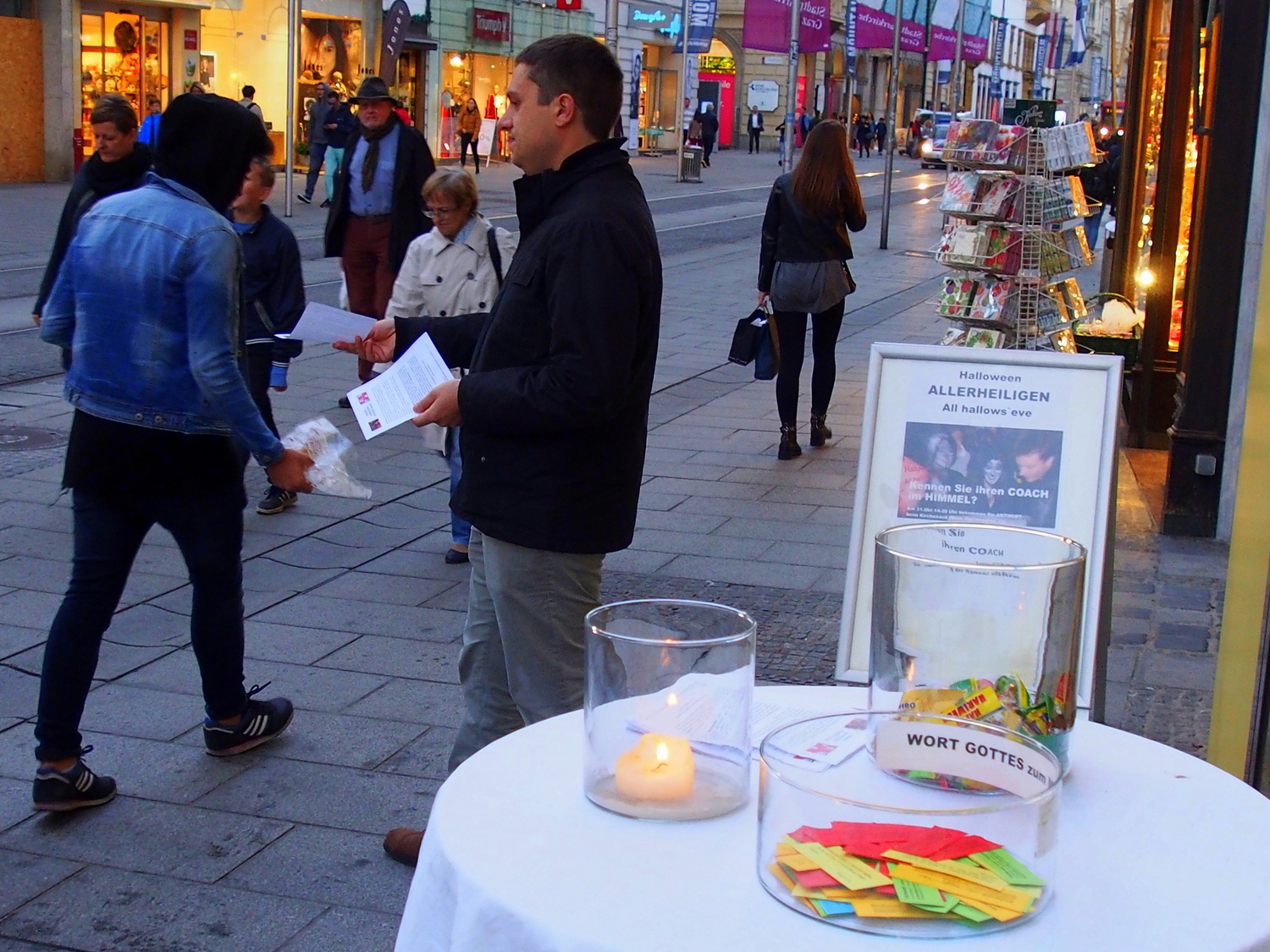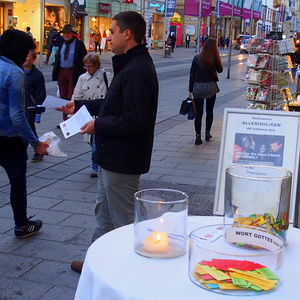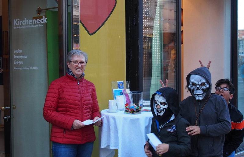 Am 31. Oktober konnte man sich im Kircheneck über die Bedeutung des eigenen Namens informieren. Die Kinder bekamen Süßes und die Erwachsenen einen Zettel, wo das Allerheiligenfest von Halloween kommend erklärt wird.