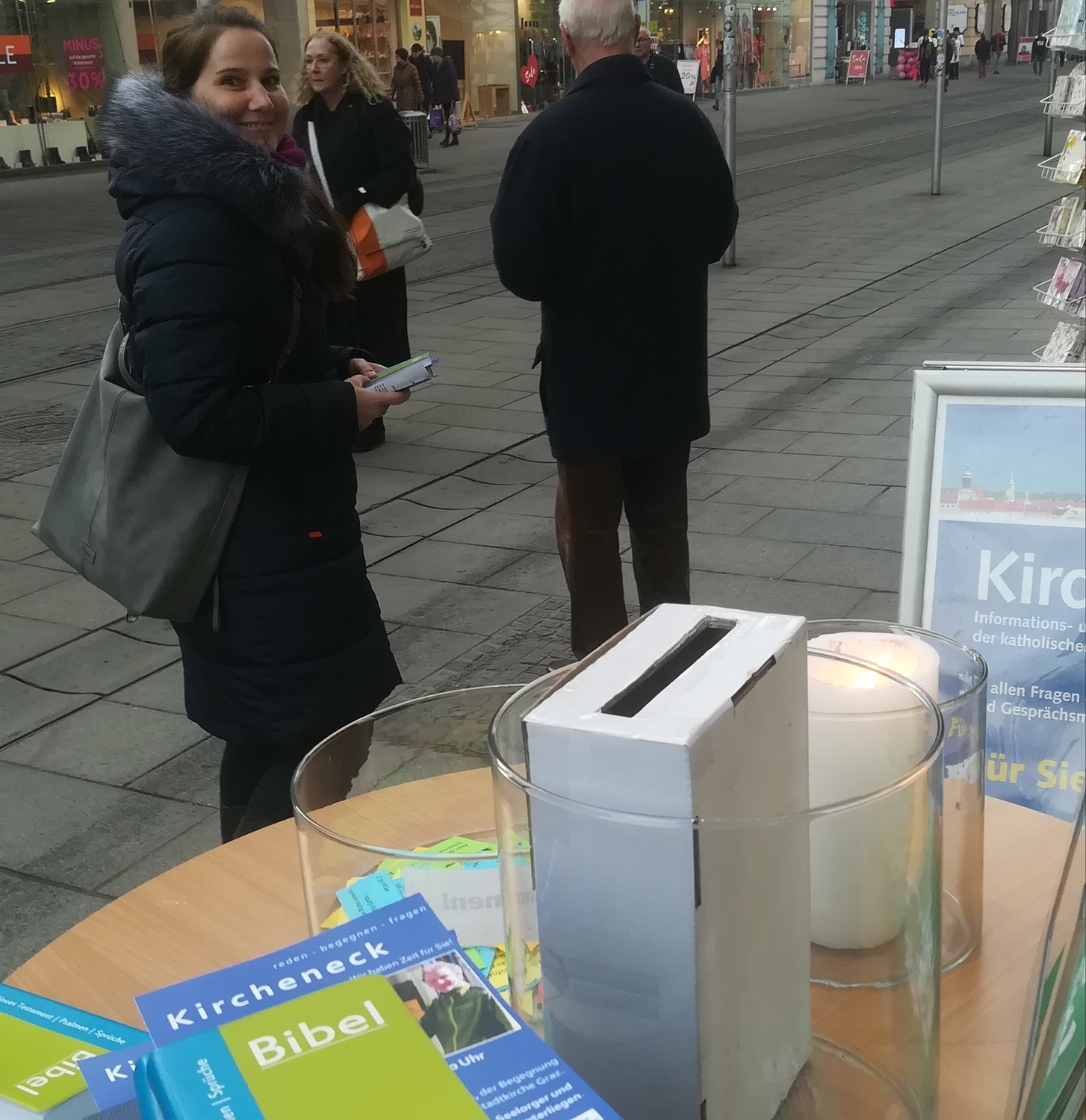 Mit einigen Menschen wurden auch kürzere oder längere Gespräche geführt. Ein Frau freute sich über diese tolle Aktion: "Endlich wird was Gscheites verteilt." Ein andere Frau bedankte sich - nach einem 20-minütigen Gespräch - für das Aufschreiben einer Fürbitte für die Sorgen ihres Mannes.