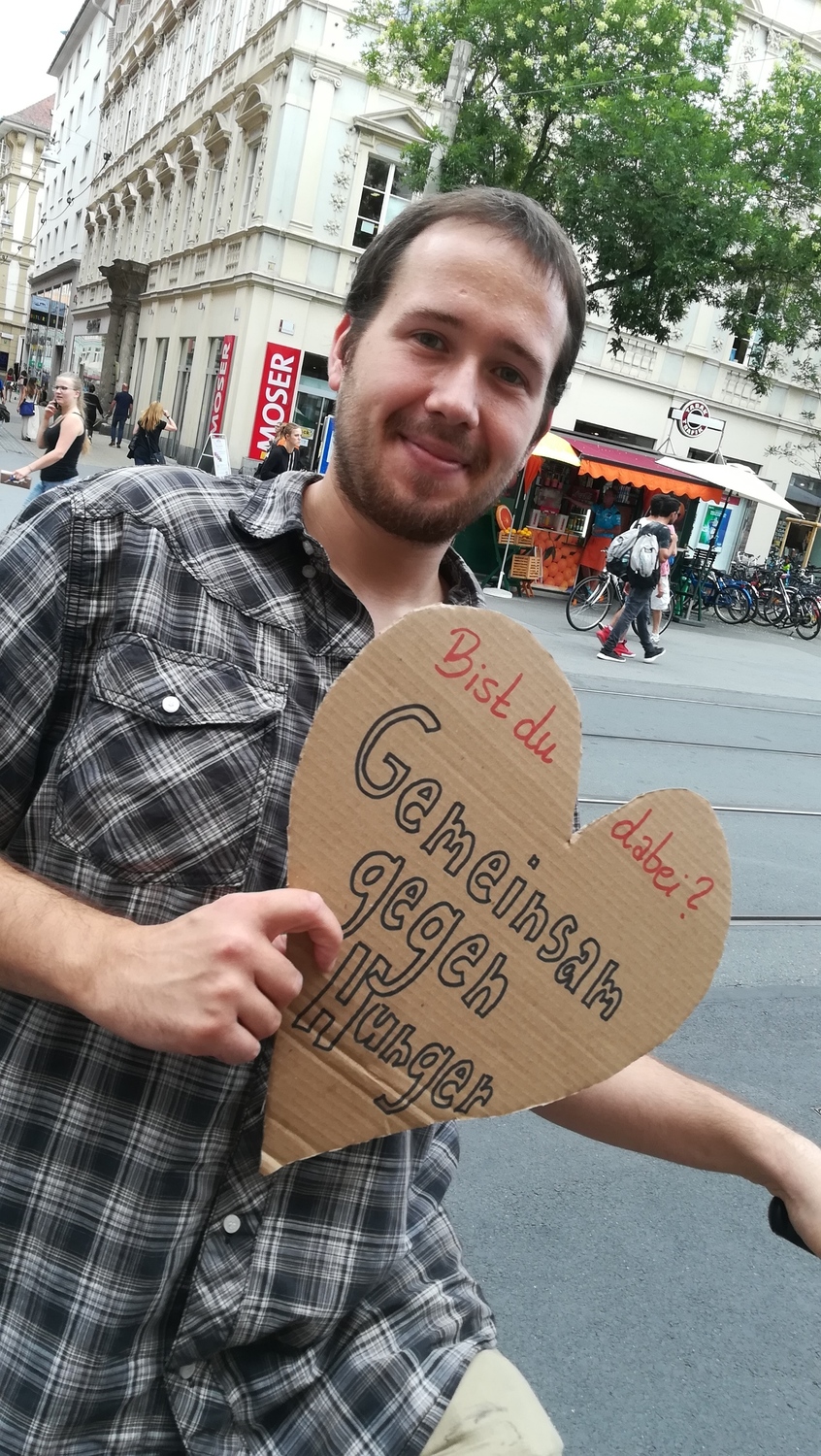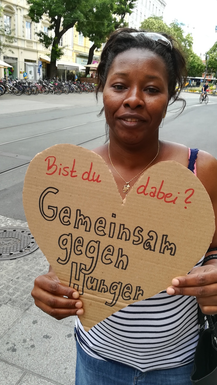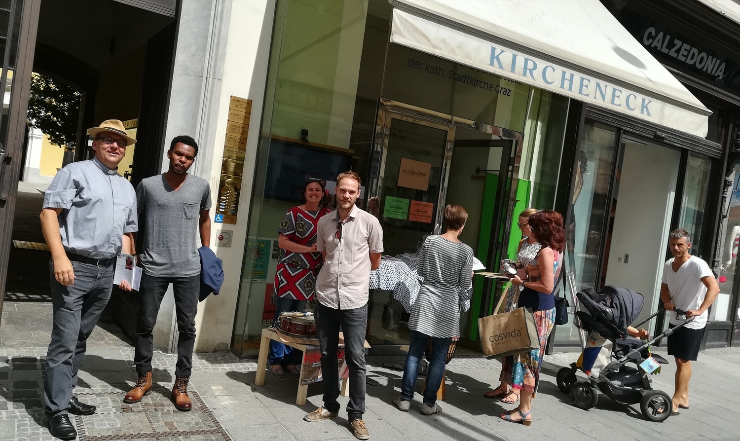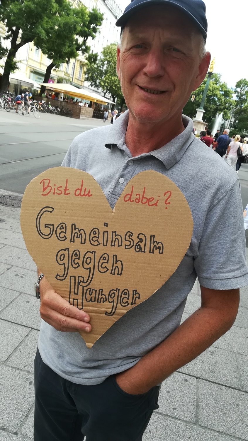 Das Kircheneck war am 28.07.2017 das "Basislager" für die Aktion gegen Hunger in Afrika. Zwischen 12 und 16 Uhr wurden die Menschen in der Grazer Innenstadt darauf aufmerksam gemacht: Man konnte spenden, sich fotografieren lassen oder sich einfach bewusst machen, dass alle 10 Sekunden ein Kind vor Hunger stirbt in Afrika und wir etwas dagegen machen können. Zum Beispiel mit 10 € kann ein Mensch im Südsudan ein Monat lang ernährt werden.