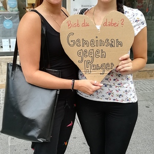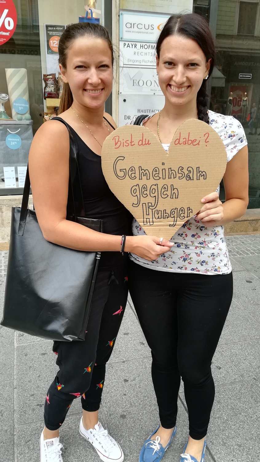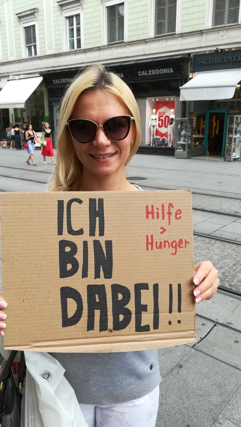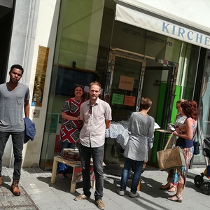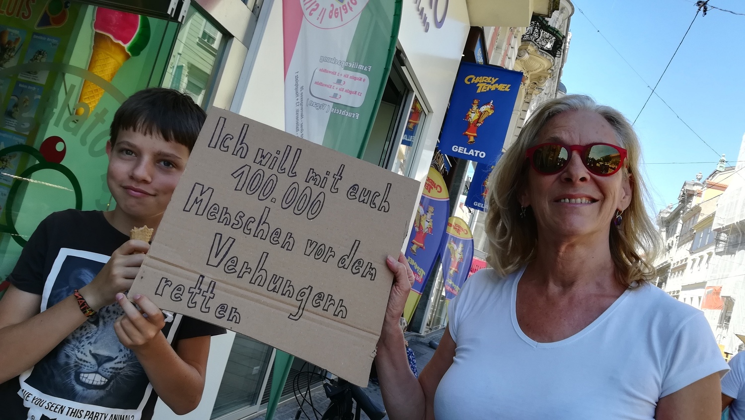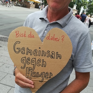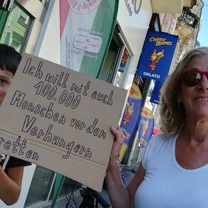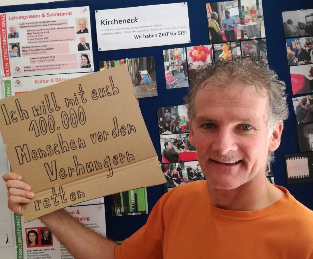 Das Kircheneck war am 28.07.2017 das "Basislager" für die Aktion gegen Hunger in Afrika. Zwischen 12 und 16 Uhr wurden die Menschen in der Grazer Innenstadt darauf aufmerksam gemacht: Man konnte spenden, sich fotografieren lassen oder sich einfach bewusst machen, dass alle 10 Sekunden ein Kind vor Hunger stirbt in Afrika und wir etwas dagegen machen können. Zum Beispiel mit 10 € kann ein Mensch im Südsudan ein Monat lang ernährt werden.