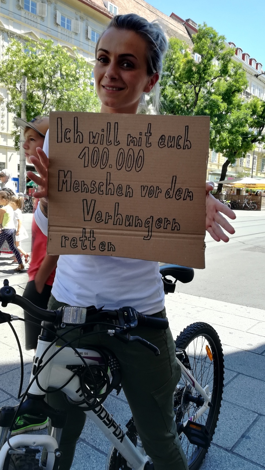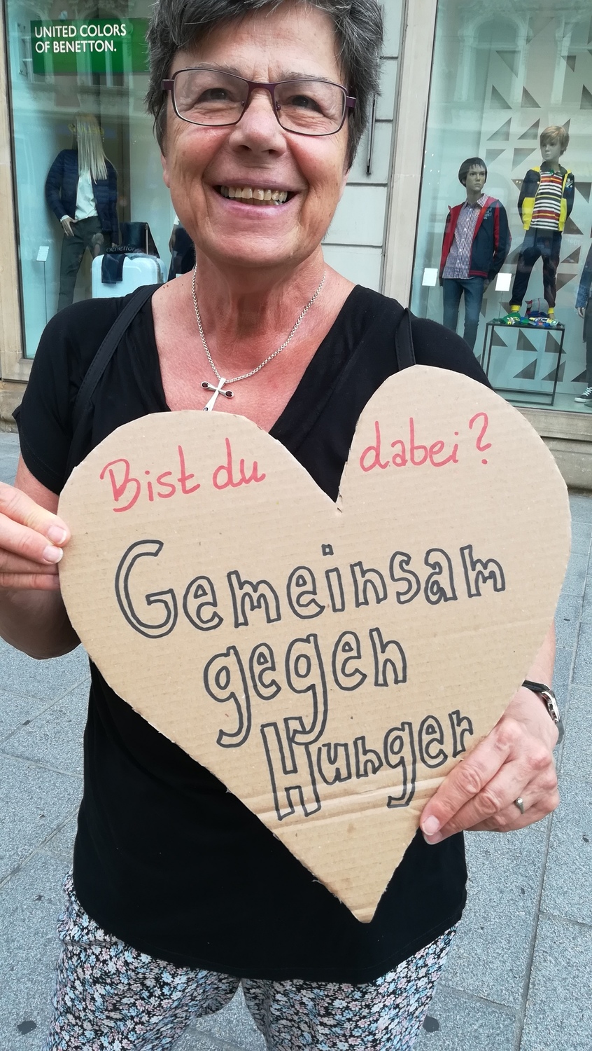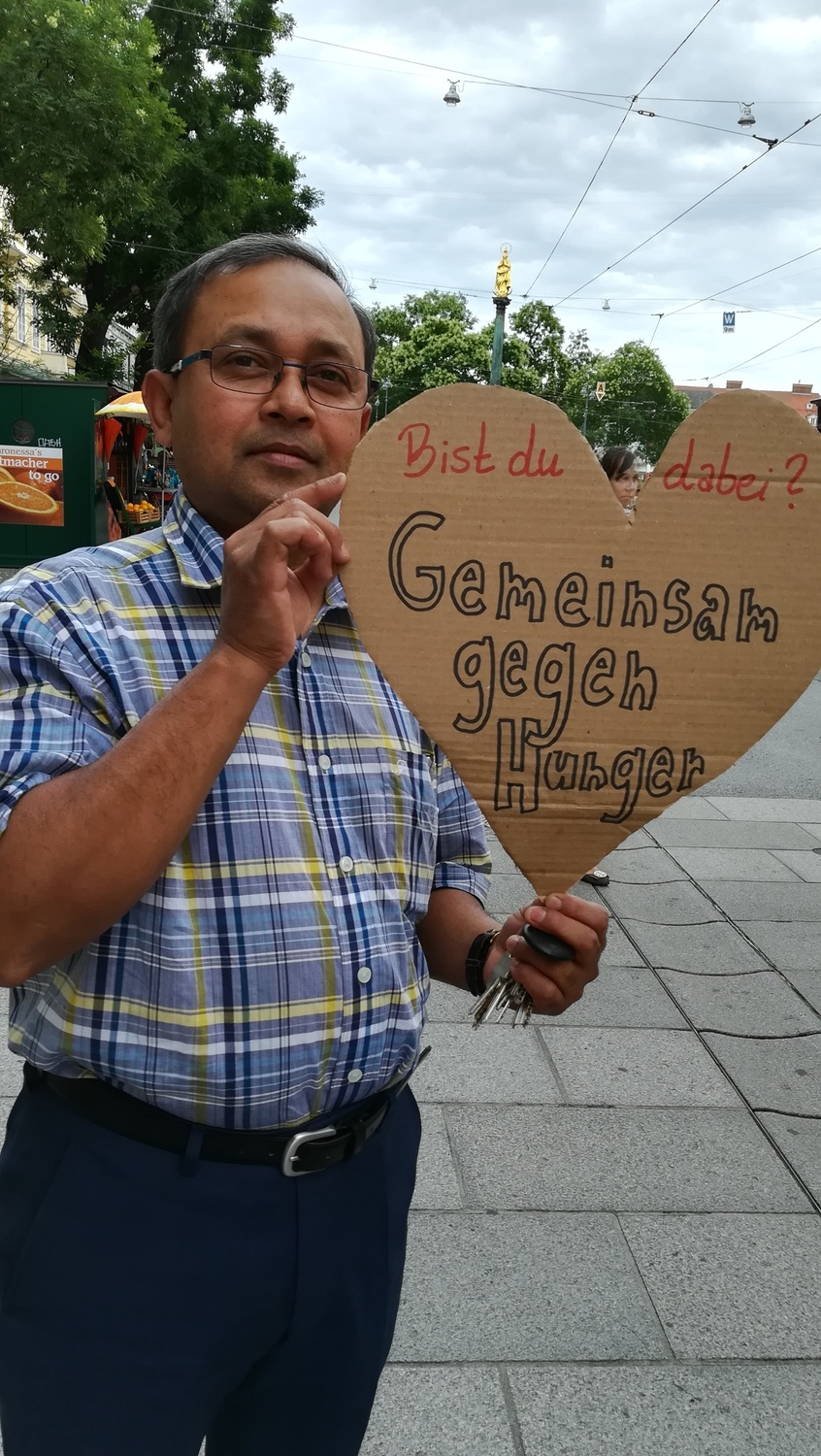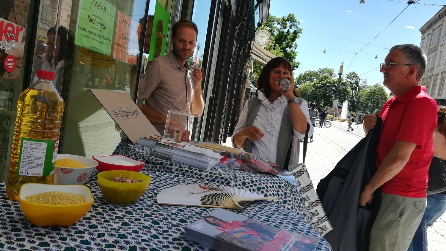 Das Kircheneck war am 28.07.2017 das "Basislager" für die Aktion gegen Hunger in Afrika. Zwischen 12 und 16 Uhr wurden die Menschen in der Grazer Innenstadt darauf aufmerksam gemacht: Man konnte spenden, sich fotografieren lassen oder sich einfach bewusst machen, dass alle 10 Sekunden ein Kind vor Hunger stirbt in Afrika und wir etwas dagegen machen können. Zum Beispiel mit 10 € kann ein Mensch im Südsudan ein Monat lang ernährt werden.