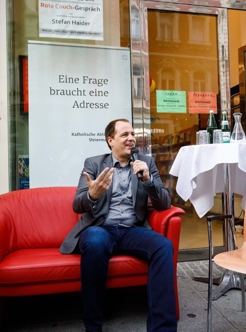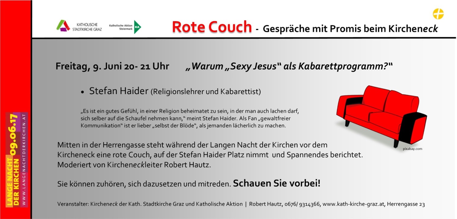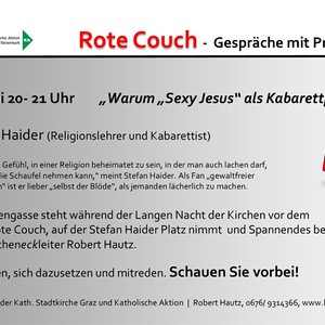 Das dritte Rote Couch-Gespräch fand am Freitag, 9. Juni, 20 Uhr im Rahmen der Langen Nacht der Kirchen statt. Kabarettist und Theologe Stefan Haider hat auf der roten Couch Platz genommen und Spannendes erzählt: z.B. warum er eines seiner Kabarettprogramme "Sexy Jesus" titelte! Ca. 35 Personen folgten interessiert dem Gespräch und beteiligten sich auch durch Fragen an Stefan Haider.