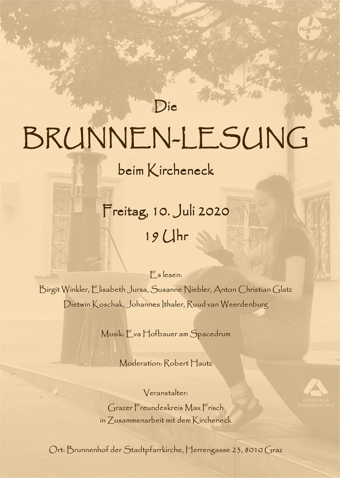 Am Freitag, 10. Juli 2020, 19:00 Uhr ladet der Grazer Freundeskreis Max Frisch in Zusammenarbeit mit dem Kircheneck zur BRUNNEN-LESUNG - einem sommerlichen Literaraturabend mit spannenden Improvisationen am Spacedrum und eigenen Texten der Autorinnen und Autoren.