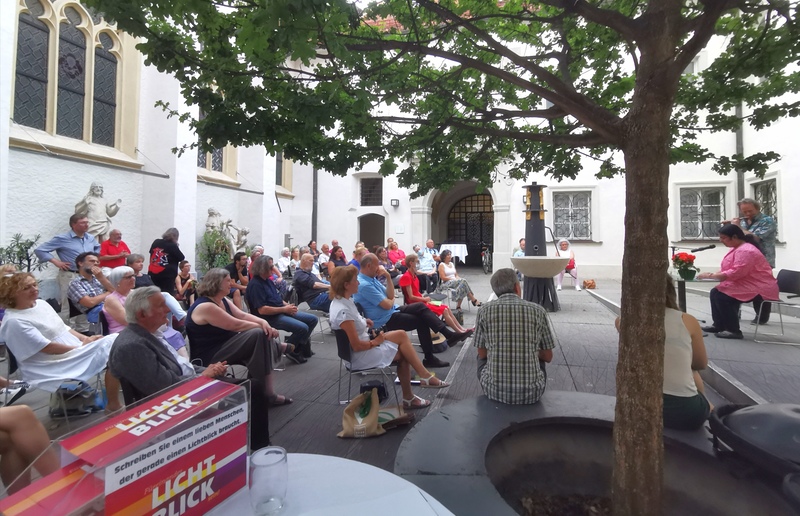Im Anschluss war man zu Begegnungen mit den Autorinnen und Autoren und einem reichhaltigen Buffet mit Getränken und Gebäck geladen. Auch zum Teil sehr tiefgehende Gespräche über Leid, Gott, Himmel und Hölle wurden geführt. Aufgrund der angenehmen Temperaturen verweilten nicht wenige bis Mitternacht im Brunnenhof.