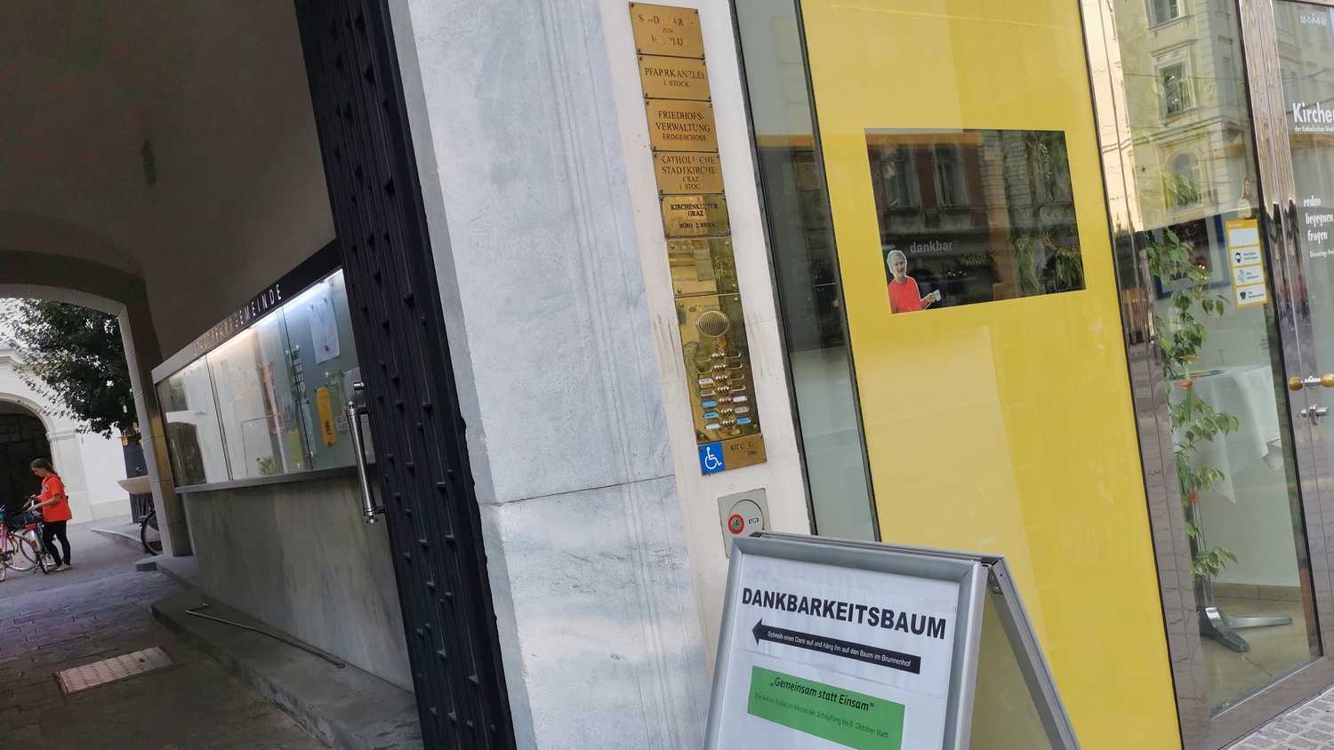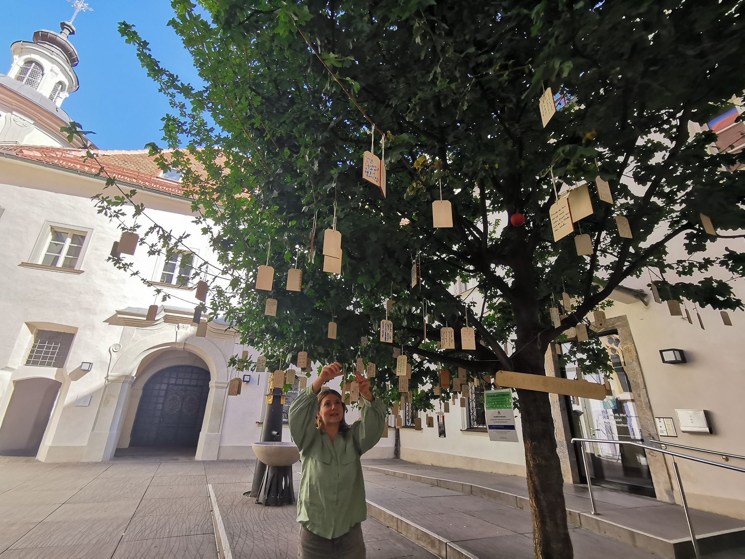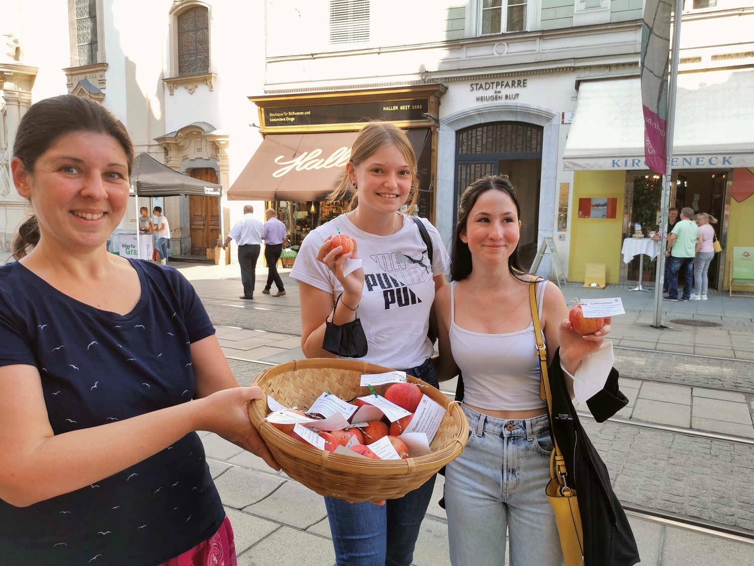 Als Zeichen des Erntedankes wurden 400 Bio-Äpfel in der Herrengasse verteilt mit der Einladung einen konkreten Dank auf die vorbereiteten Holzplättchen zu schreiben und auf den Dankbarkeitsbaum im Brunnenhof beim Kircheneck zu hängen. In der Aktionszeit vom 11. September bis 8. Oktober 2021 wurden beinahe 300 zum Teil sehr persönliche und berührende DANKE-Worte aufgehängt. Wie zum Beispiel: