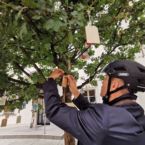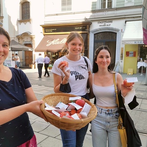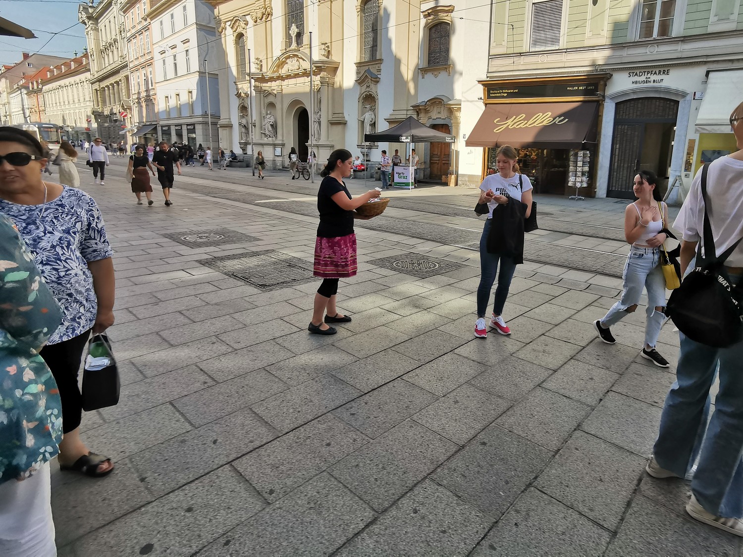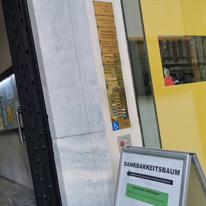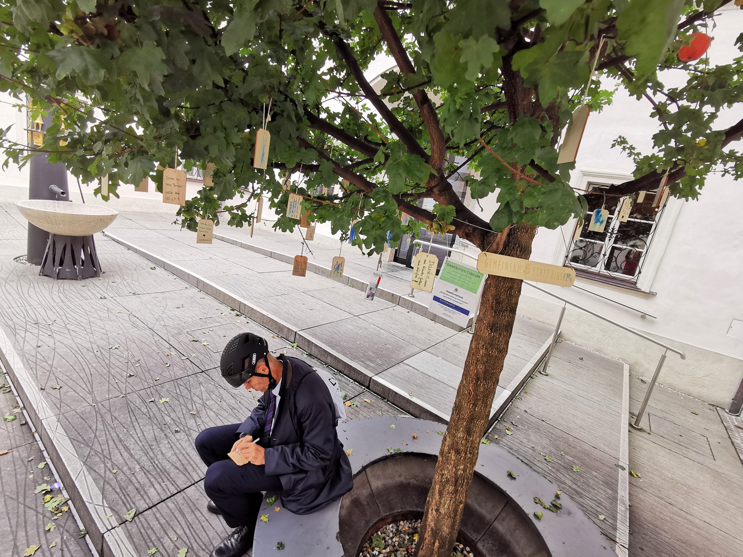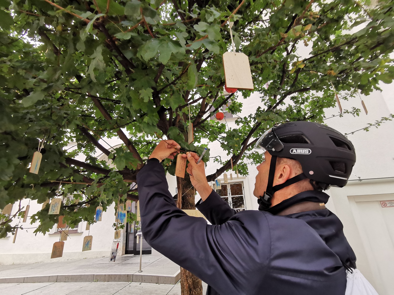 Als Zeichen des Erntedankes wurden 400 Bio-Äpfel in der Herrengasse verteilt mit der Einladung einen konkreten Dank auf die vorbereiteten Holzplättchen zu schreiben und auf den Dankbarkeitsbaum im Brunnenhof beim Kircheneck zu hängen. In der Aktionszeit vom 11. September bis 8. Oktober 2021 wurden beinahe 300 zum Teil sehr persönliche und berührende DANKE-Worte aufgehängt. Wie zum Beispiel: