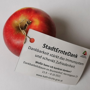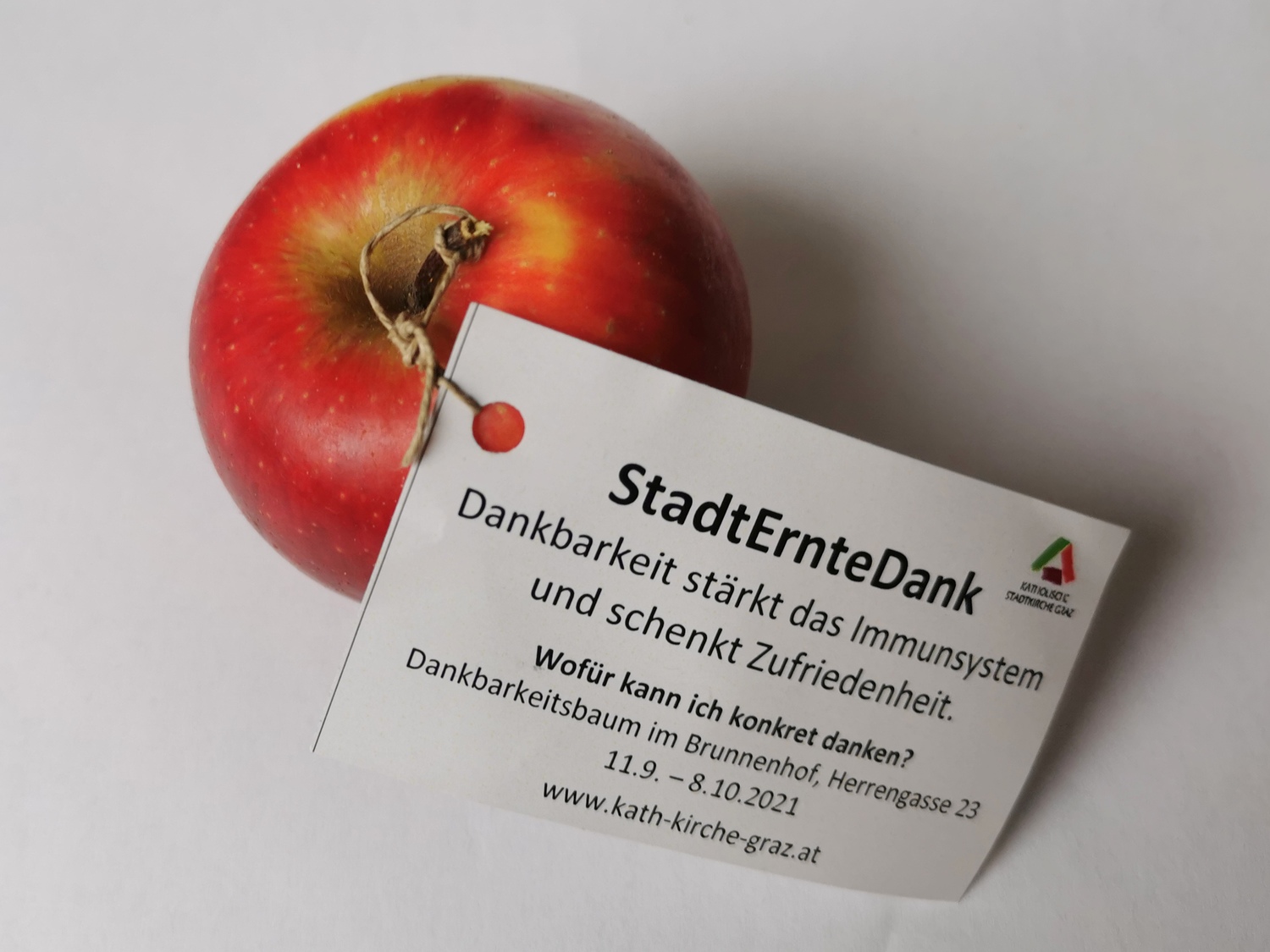 Die StadtErnteDank-Aktion 2021 ist eine Weiterentwicklung obiger Idee* der Katholischen Stadtkirche Graz, eine Ermutigung zu einer dankbaren Lebenshaltung unter dem Motto: „Dankbarkeit stärkt das Immunsystem und schenkt Zufriedenheit“.
