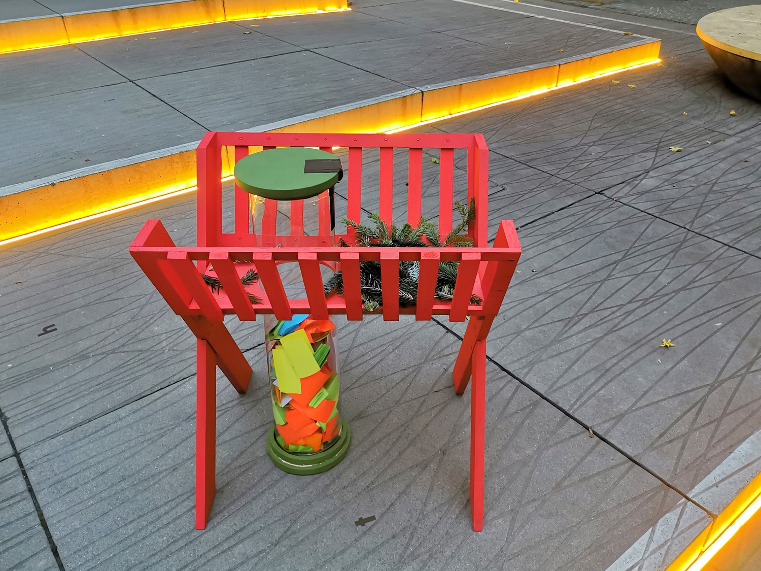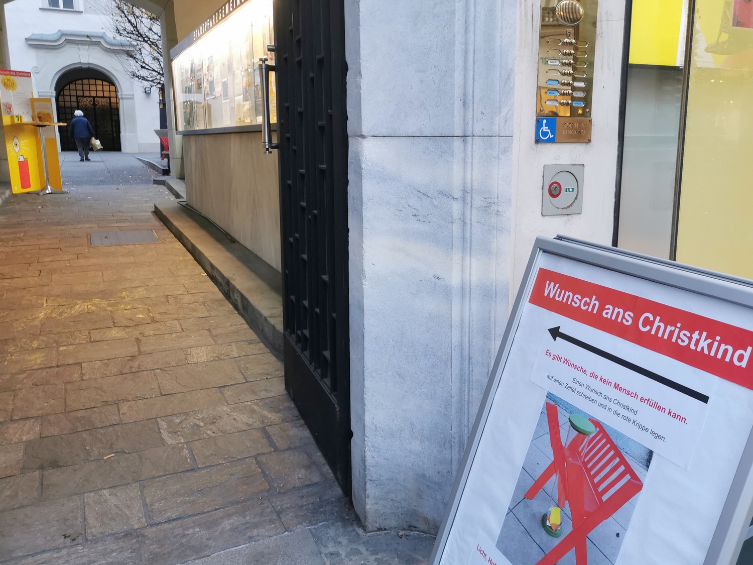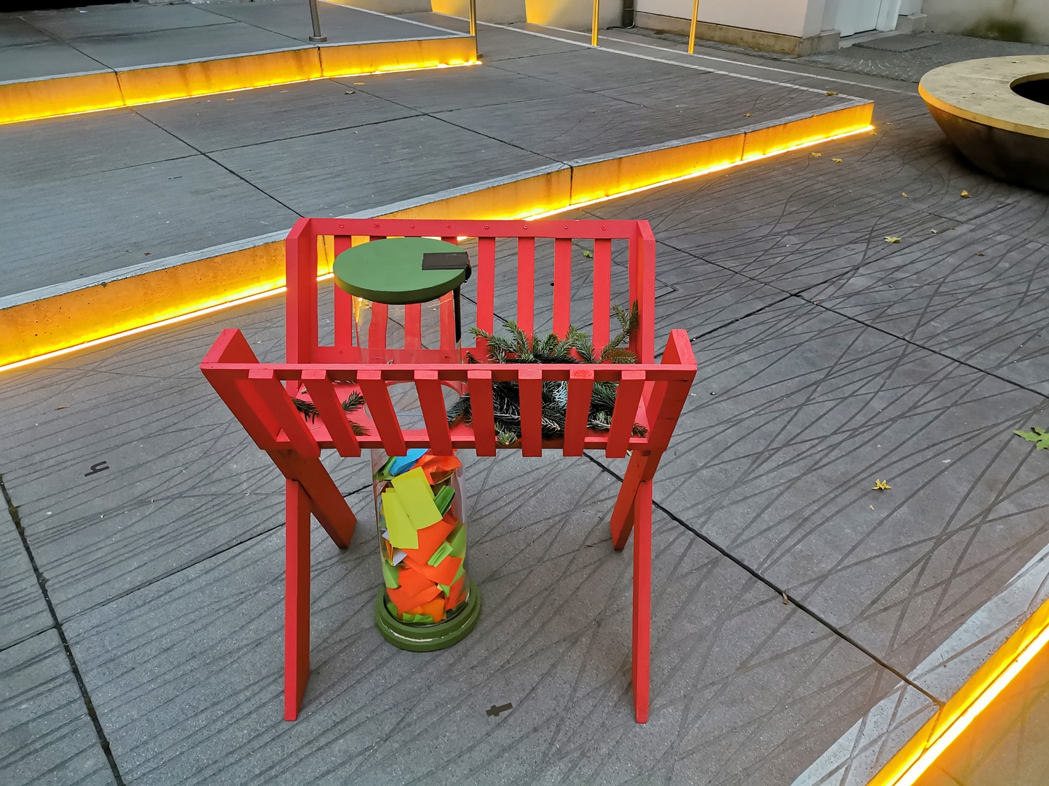 auf einen Zettel schreiben und in die rote Krippe legen.