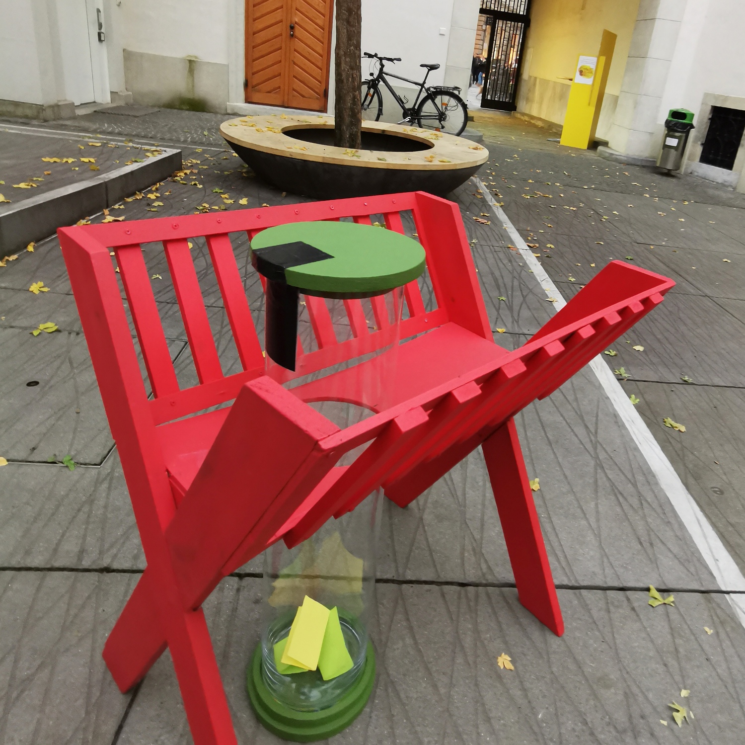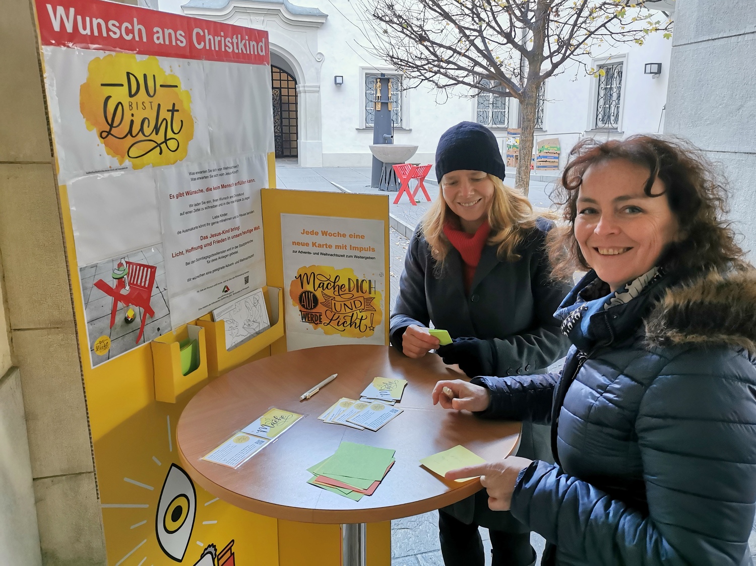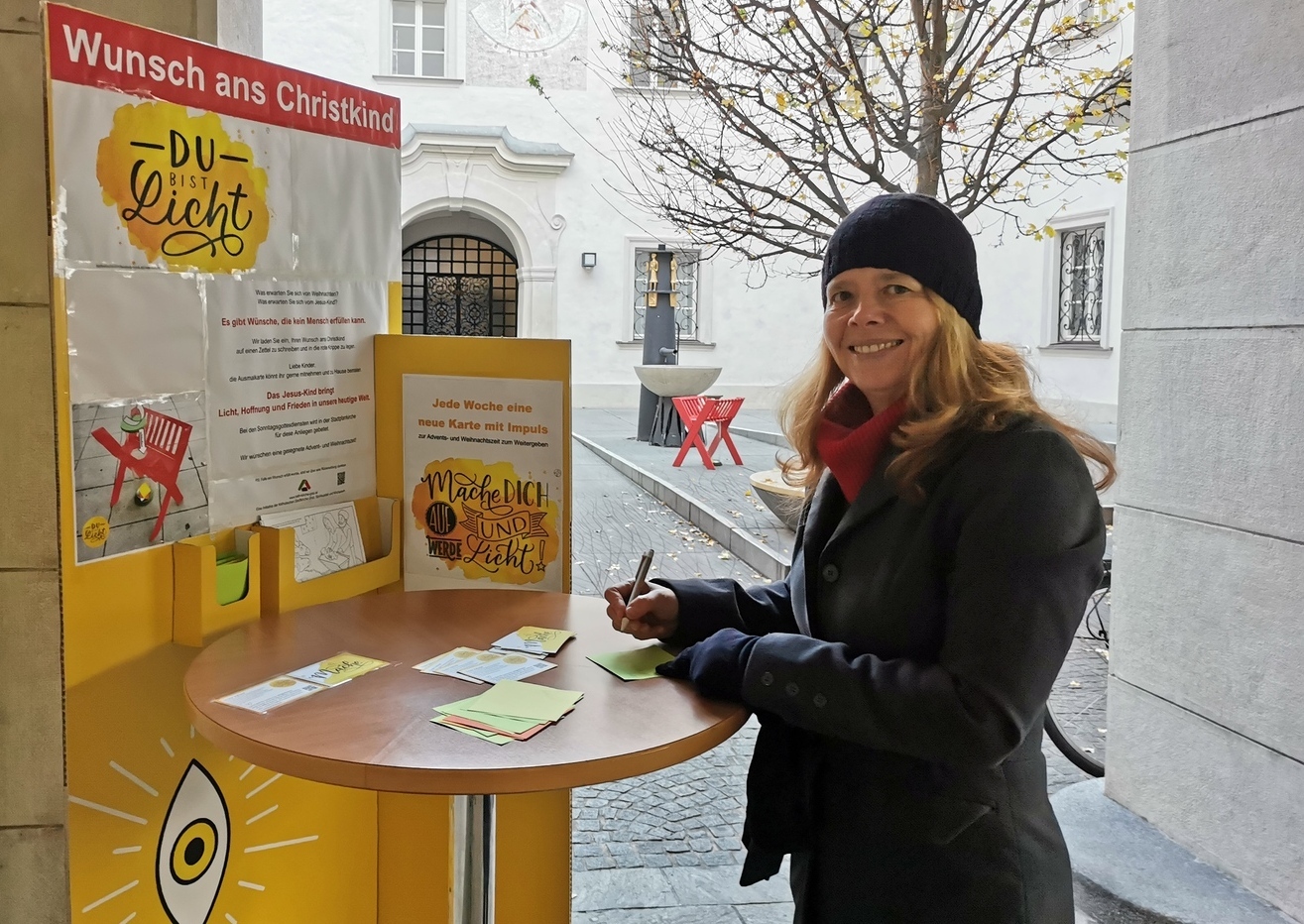 auf einen Zettel schreiben und in die rote Krippe legen.