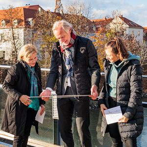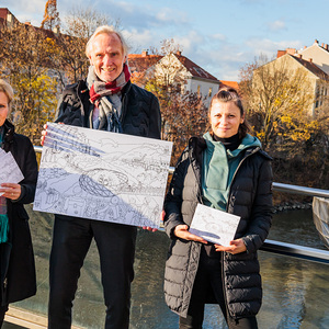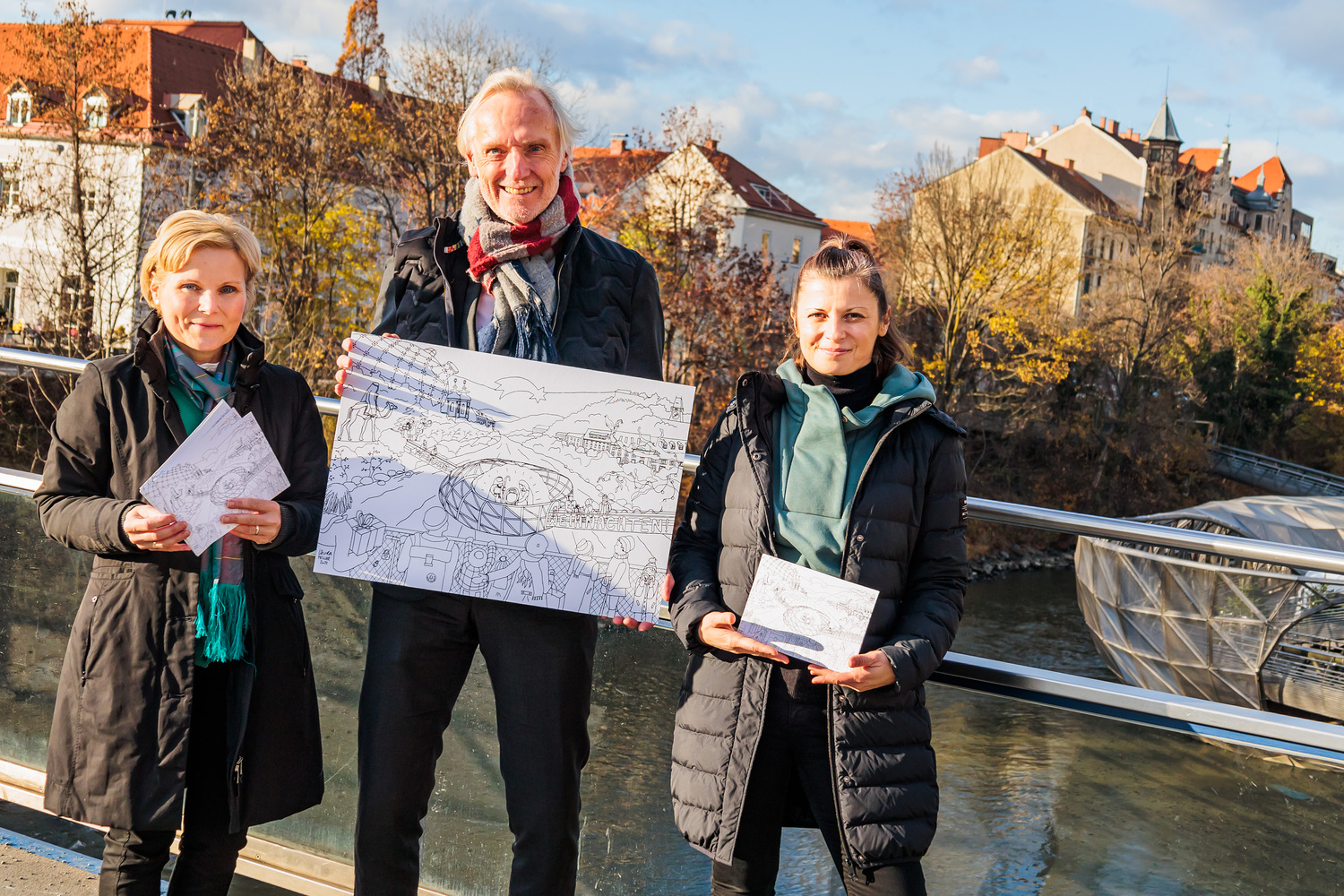 Freuen sich über die neue Weihnachtsausmalkarte: Kulturreferentin Gertraud Schaller-Pressler, Wirtschaftsstadtrat Günther Riegler und Citymanagerin Verena Hölzlsauer. Foto: Neuhold