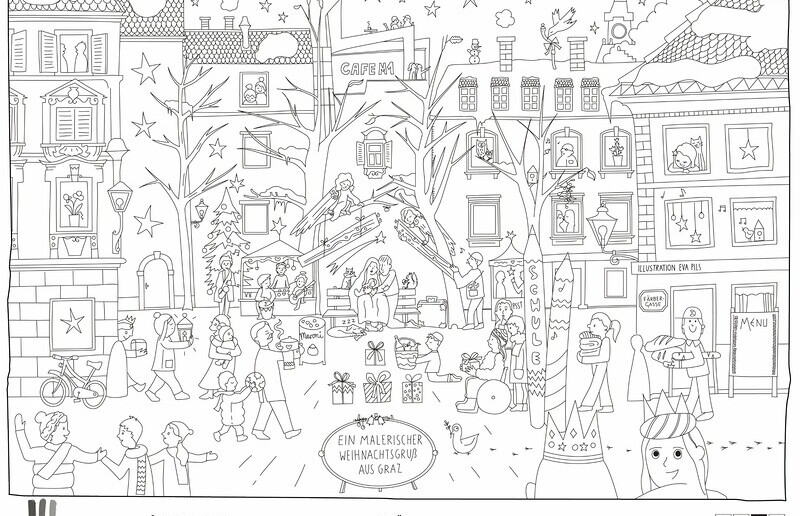 Die Grazer Illustratorin Eva Pils hat die diesjährige weihnachtliche Ausmalkarte gestaltet, die von Kirchen Kultur Graz und Holding Graz herausgegeben wird. Sie übersetzt die traditionelle Weihnachtsgeschichte in unsere heutige Lebenswelt und zeigt die Krippe in vielen liebevollen Details mitten in Graz am Färberplatz.