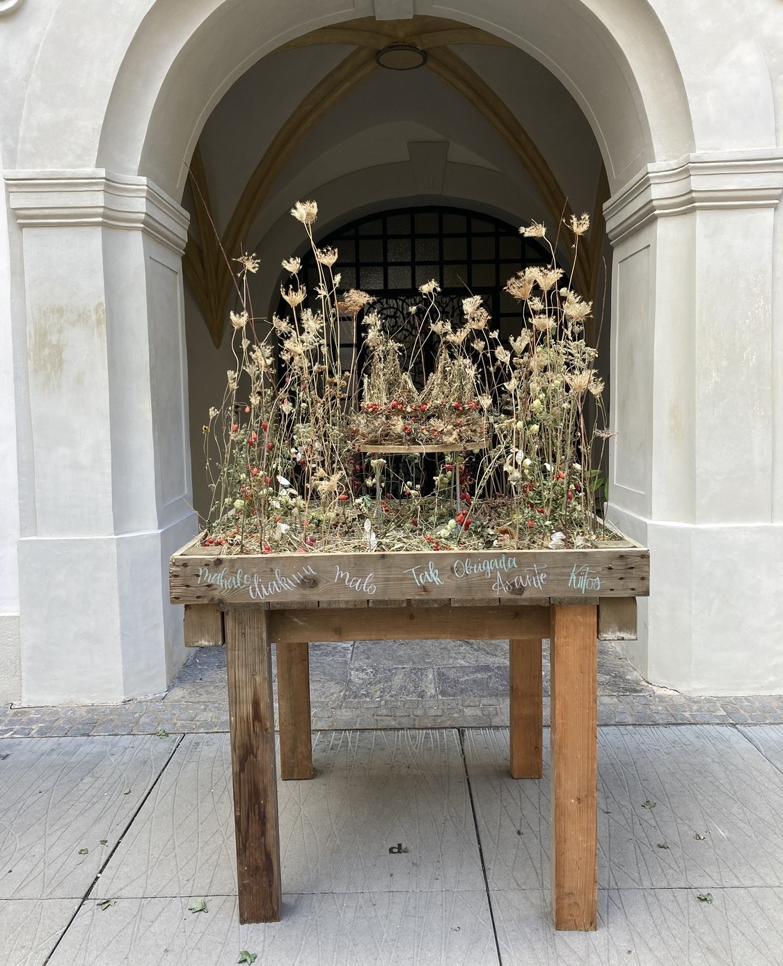 Es wurden hier vordergründig unscheinbare Pflanzen eingearbeitet, die auf artenreichen Blühwiesen, betreut von der Natur.Werk.Stadt Graz - wuchsen. Diese "Beikräuter" erfüllen wertvolle Funktionen im Lebensnetzwerk „Schöpfung“, das alles Lebendige trägt. Es soll ein neues Bewusstsein geschaffen werden für die erstaunlich hohe Artenvielfalt, die auch im urbanen Raum (kein Pestizideinsatz, keine Monokulturen) möglich ist. Die Stadt.Ernte.Dank.Krone der Vielfalt, die zudem das Wort „Danke“ in vielen Sprachen schmückt, ist eine Neudeutung der guten christlichen Erntedank-Tradition in Zeiten der Klima- und Biodiversitätskrise. Sie ist ein vielsprachiges Zeichen der Dankbarkeit mitten in der Stadt, wo - wie auf dem Land - gute Ernte auch heute lebenswichtig ist.