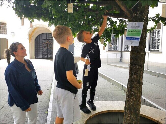 Beim Stadt.Ernte.Dank Graz 2025 können Vorbeigehende wieder einen konkreten Dank aufschreiben und auf den Dankebaum im Brunnenhof beim Kircheneck hängen.