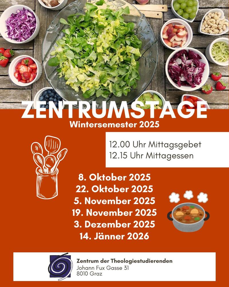 Mi 22. Okt, 12.00 Uhr, Zentrumstag: 12.00 Uhr Mittagsgebet, 12.15 Uhr Mittagessen im Theozentrum: Johann Fux Gasse 31