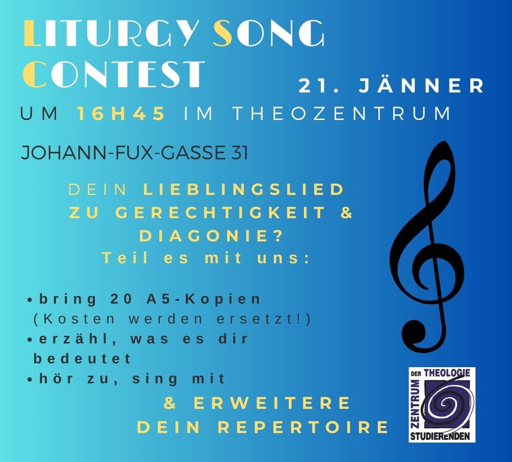 Mi 21. Jän, Liturgy Song Contest 16.45 Uhr im Theozentrum. Diesmal Lieder mit sozialem/diakonalem Inhalt. Mehr Info bei Sr Katharina Fuchs oder Johannes Schweighofer
