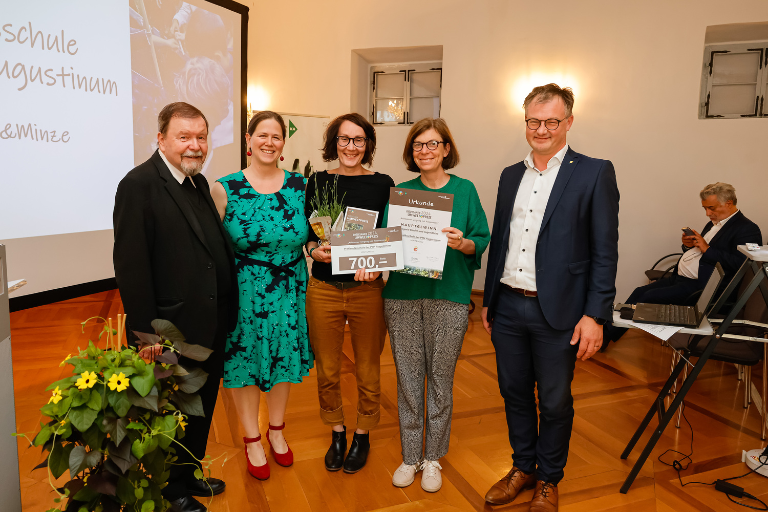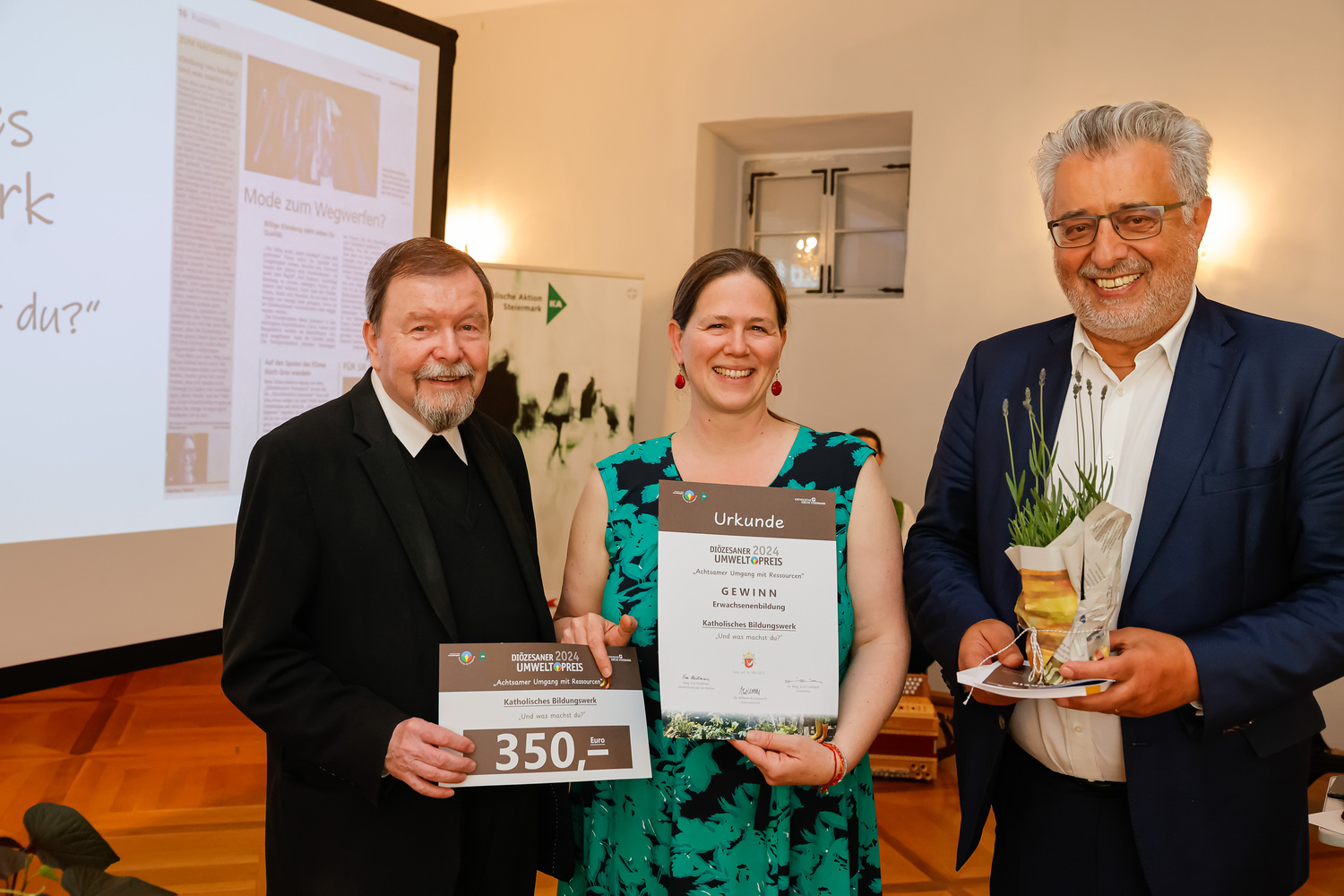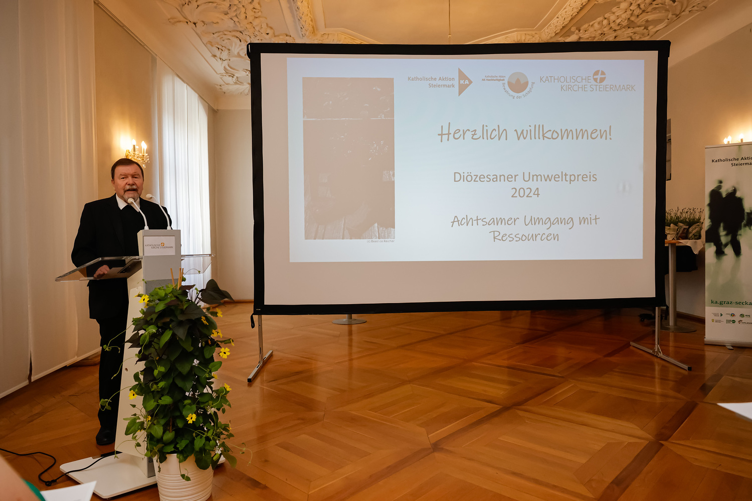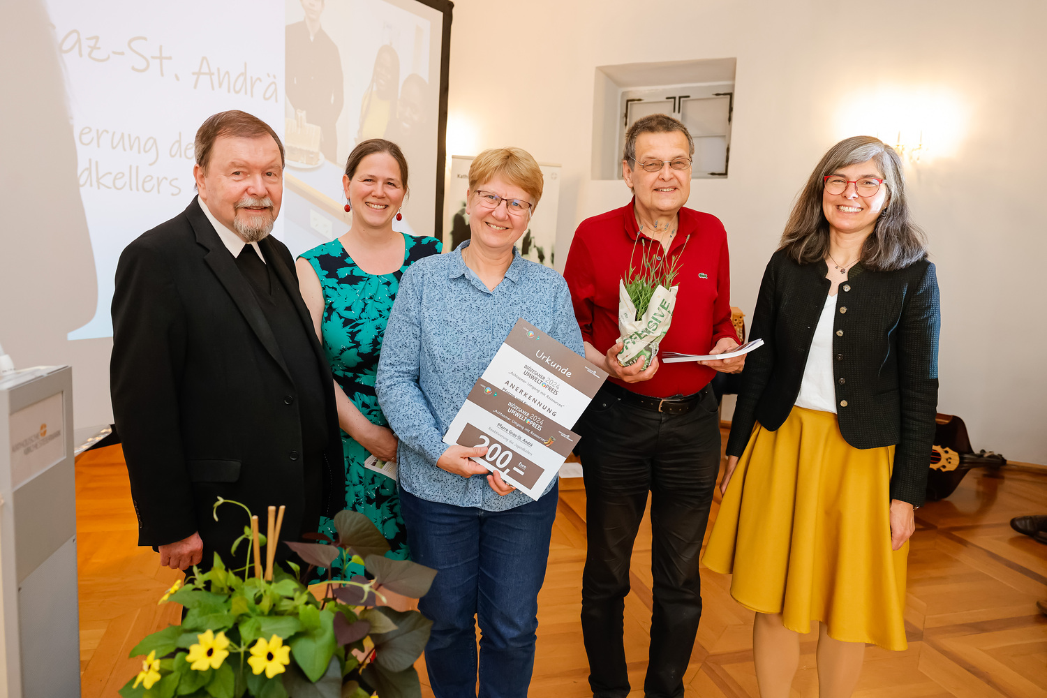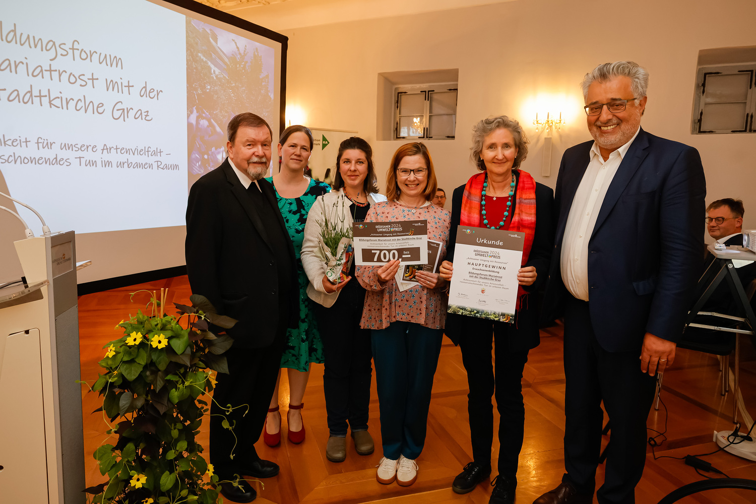 Bereits zum 16. Mal vergab der Arbeitskreis Nachhaltigkeit (AKN) der Katholischen Aktion (KA) den Diözesanen Umweltpreis, der in diesem Jahr unter dem Titel „Achtsamer Umgang mit Ressourcen“ stand. Die Bedeutung der Dankbarkeit gegenüber Gott und der Schöpfung strich Generalvikar Erich Linhardt in seinem Grußwort hervor. Er überreichte die Preise gemeinsam mit der Umweltbeauftragten Eva Heidlmair sowie mit Andreas Gjecaj, Präsident der KA-Steiermark, Martin Halmer, Ökonom der Diözese sowie Anna Kirchengast, Vorstandsmitglied des AKN. Anna Kirchengast stellte in ihrem Grußwort Bezüge zur vor 10 Jahren erschienen Enzyklika Laudato si‘, zur kürzlich durchgeführten Diözesankonferenz und den eingereichten Projekten her – sie alle sind Hoffnungszeichen für eine gute Zukunft.