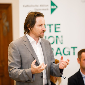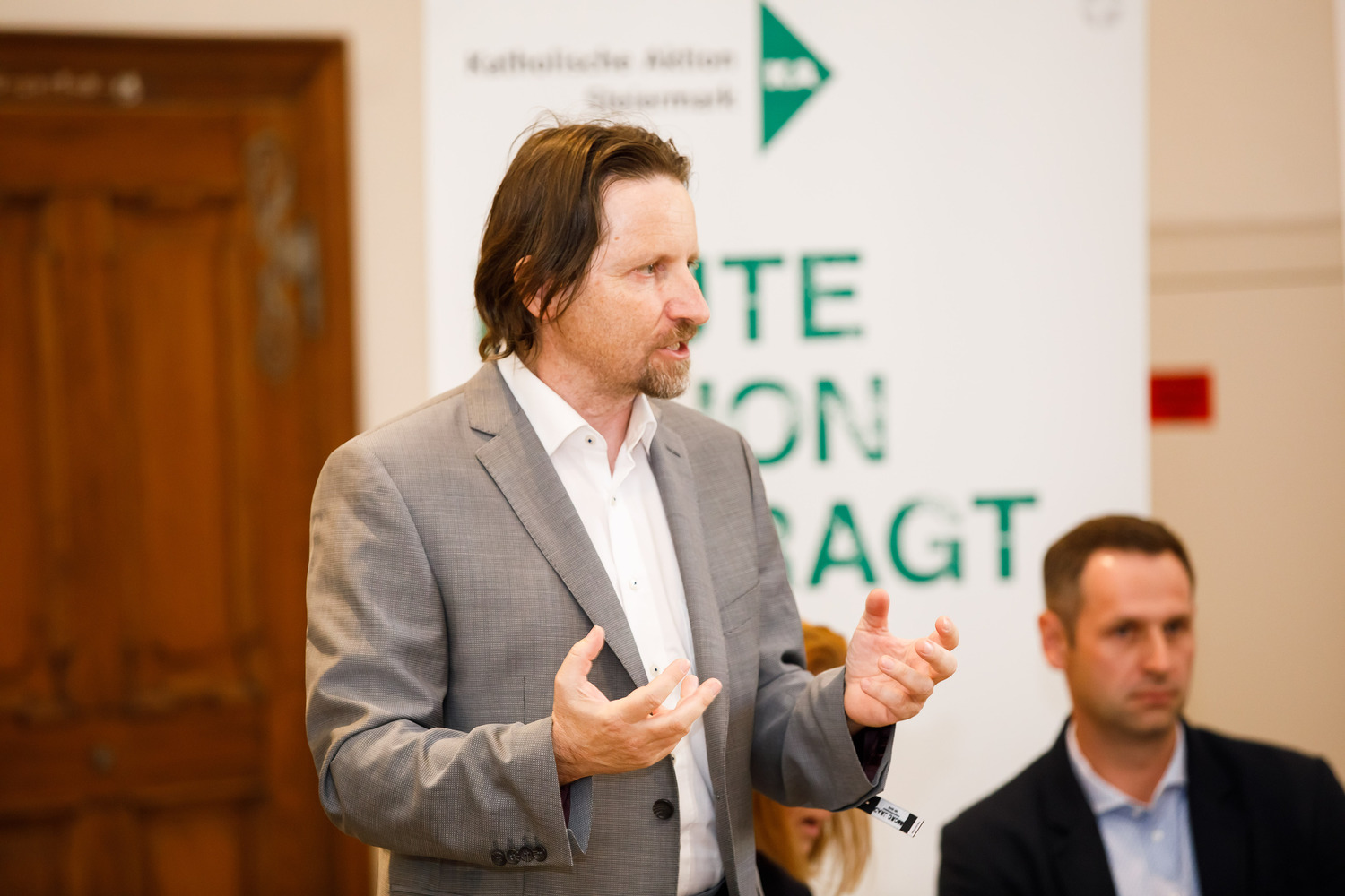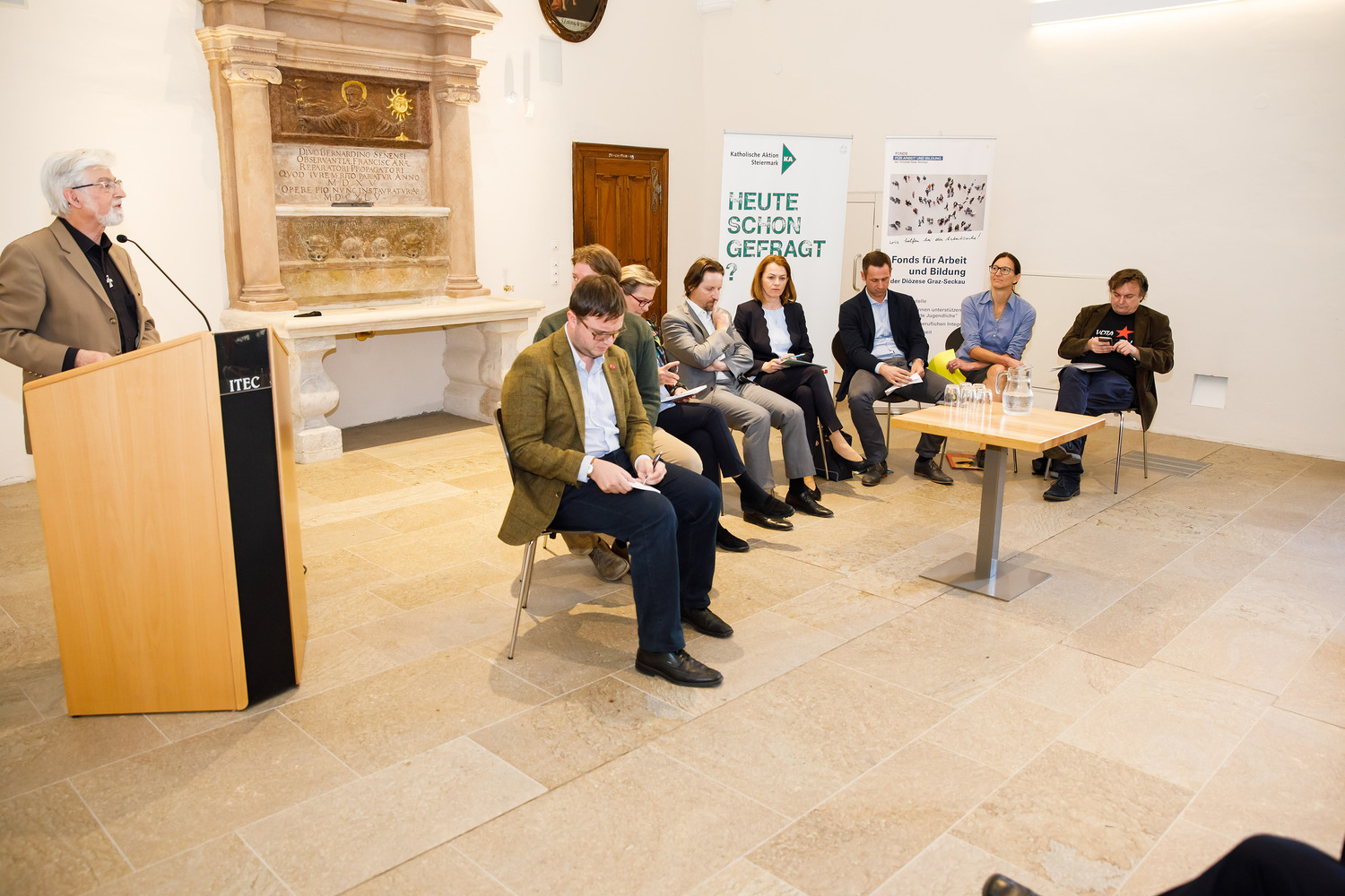 Grußworte von Anna Hollwöger, Katholische Aktion Steiermark, und Peter Hochegger, Fonds für Arbeit und Bildung, eröffneten den Abend.