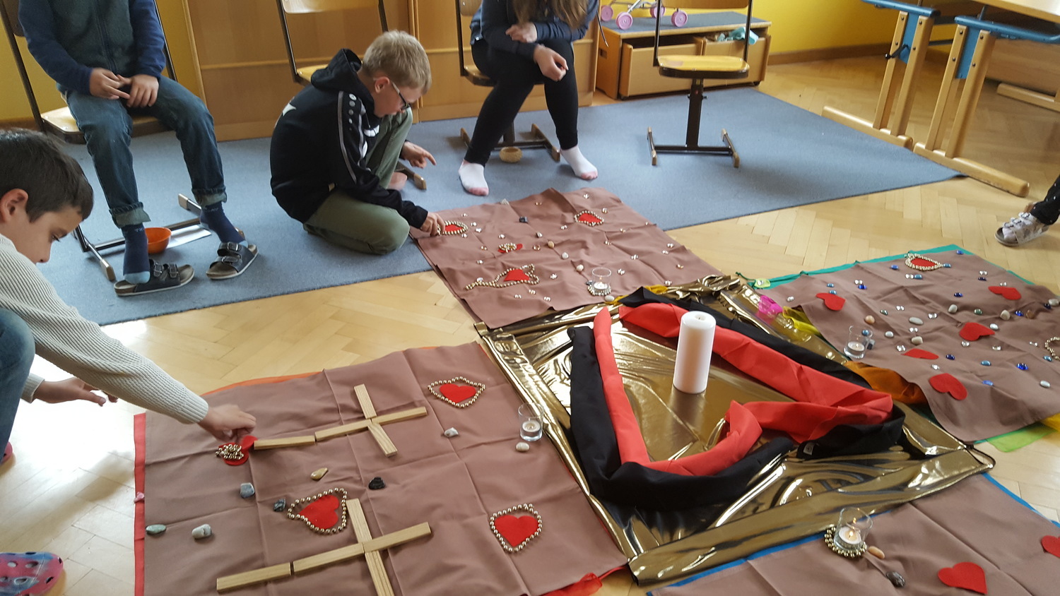 Gemeinsam mit den Kindern werden religiöse Inhalte und Schwerpunkte ohne Zeitdruck erarbeitet und anhand von Legematerialien zu wundervollen Bodenbildern gestaltet. Die Einheiten werden mit Liedern, Tänzen, bewussten Sinneswahrnehmungen und Geschichten gestaltet.
