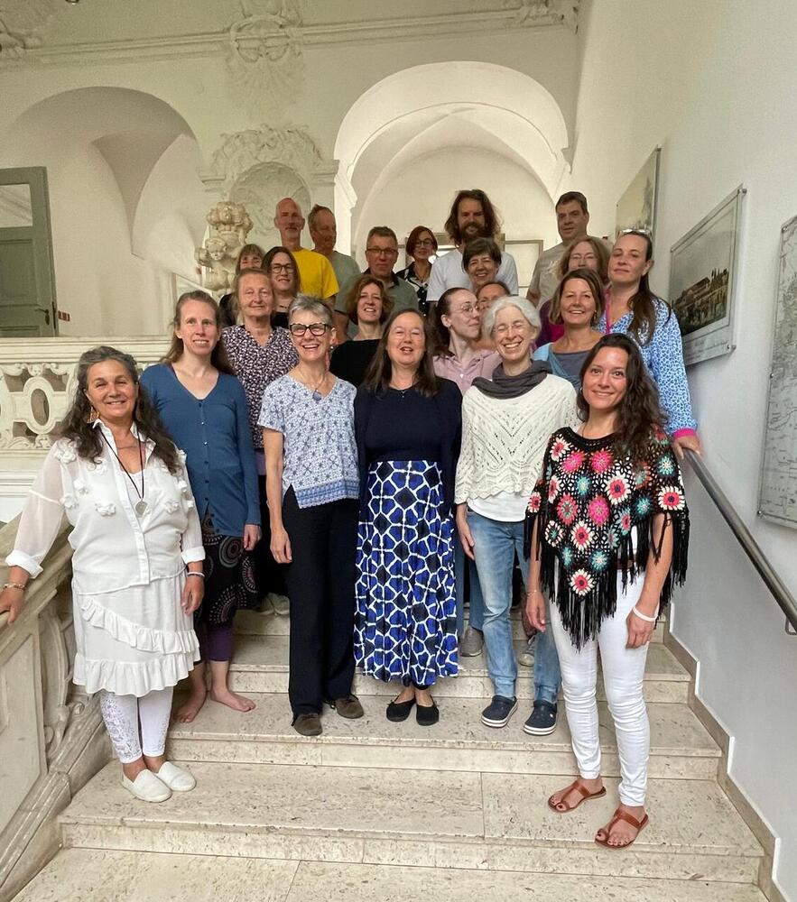 31 bereits erfahrene, begeisterte Teilnehmer:innen aus Österreich, Deutschland und der Schweiz erarbeiteten vom 13. bis 16. Juli im Schloss Retzhof in der Südsteiermark ein umfangreiches, methodisch-didaktisch neu aufbereitetes Repertoire kraftvoller Chants und heilsamer Lieder sowie zahlreiche choreografische Handlungsanleitungen für die persönliche Arbeit mit unterschiedlichen Singgruppen. Schwerpunkt der Intensiv-Weiterbildung lag zudem auf dem Schaffen neuer Resonanzräume auf der Basis von Angenommensein und Gemeinschaft, Zuwendung und Begeisterungsfähigkeit.