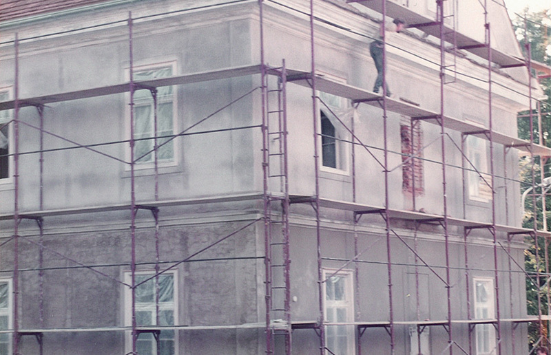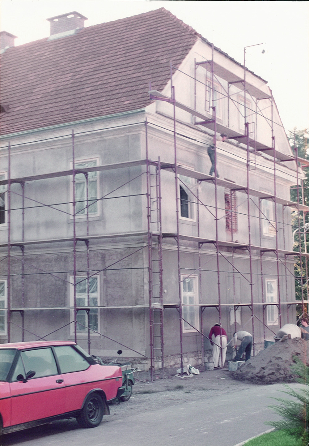 LEISTUNG: Neue Fenster in altem Stil, Heizung für feste Brennstoffe und Öl, Toilettenanlagen, Kläranlage, Elektroinstallation, Ausbau des Jugendkellers, Ausmalen, Türenstreichen, neue Fußböden mit Ausnahme der alten Fliesen, neuer Eingang – dadurch Gewinn eines Raumes.