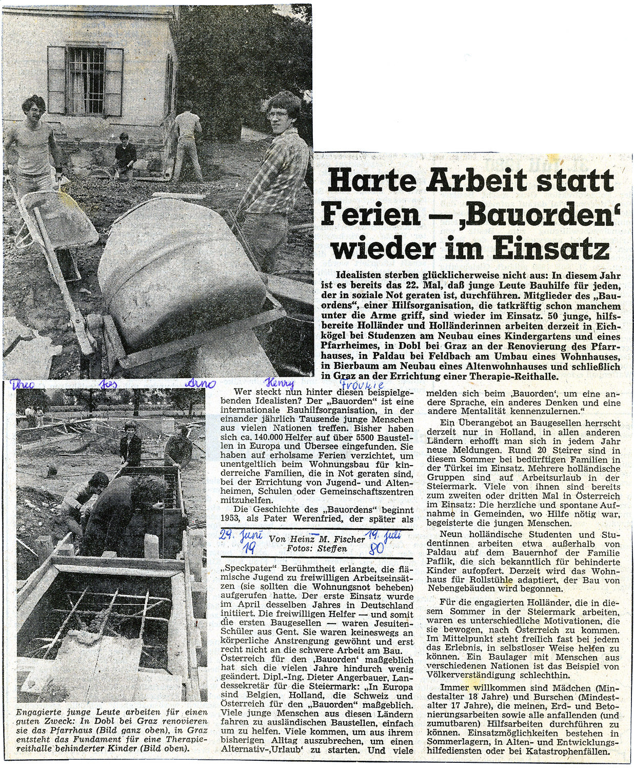 Erste Ausbaustufe bis November. Wie gemeldet, wird im Pfarrhof Dobl ein Gemeindezentrum eingerichtet. Das Ordinariat beauftragte die Architekten Angerbauer — Stummer mit der Planung, Ausschreibung und Bauüberwachung, da zu wenig eigene Kräfte vorhanden waren. In Zusammenarbeit mit dem Pfarrgemeinderat und dessen Bauausschuss entstand ein Konzept, das vom Bauamt genehmigt wurde. Eine Million Schilling zuzüglich der Weingartenstiftung von 112.000 S stehen für 1981 zur Verfügung. Mit diesem Geld werden folgende Leistungen erbracht: Zentralheizung, neue Fenster, neue Elektroinstallation, Baumeisterarbeiten, neue Fußböden, Malerarbeiten, WC-Anlagen usw. Wertvolle Arbeit leistete auch heuer wieder der holländische Bauorden. Wenn alle Arbeiten planmäßig abgeschlossen werden, so stehen ab November zwei Jugendräume im Keller, ein Saal für ca. 70 Personen, ein Besprechungsraum, eine Küche sowie die neue Pfarrkanzlei für die Pfarrarbeit zur Verfügung. Die Gestaltung des oberen Stockwerkes und die Renovierung der Außenfassade müssen auf einen späteren Zeitraum verschoben werden.