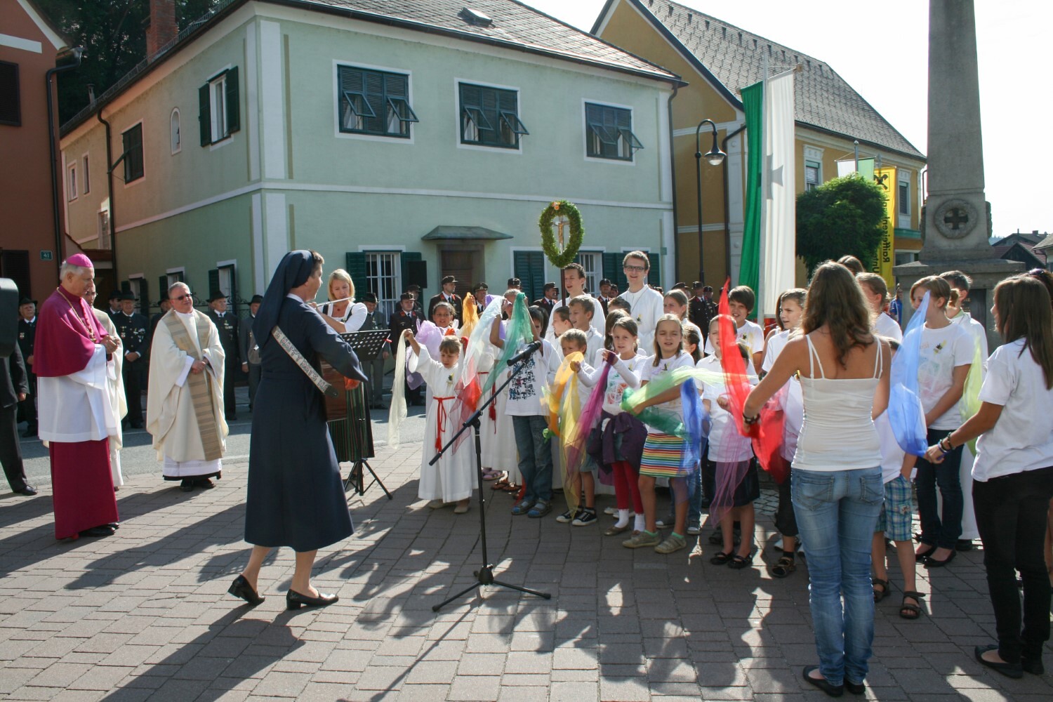 Begrüßung von Bischof Egon Kapellari vor dem Gemeindeamt