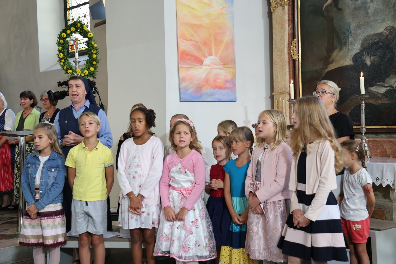Sr. Maria begleitet die Erstkommunionkinder in den Schlosshof.