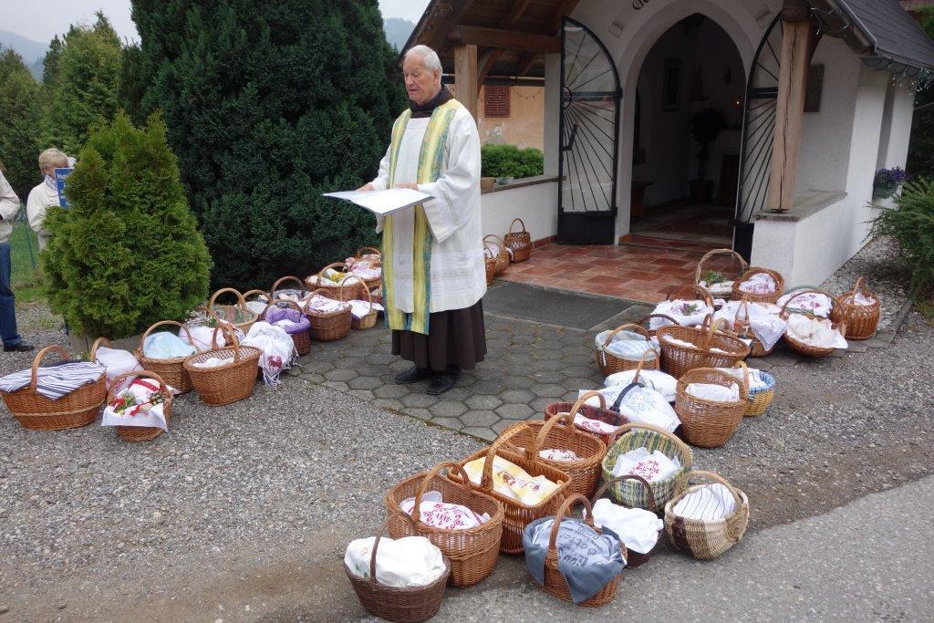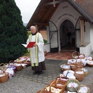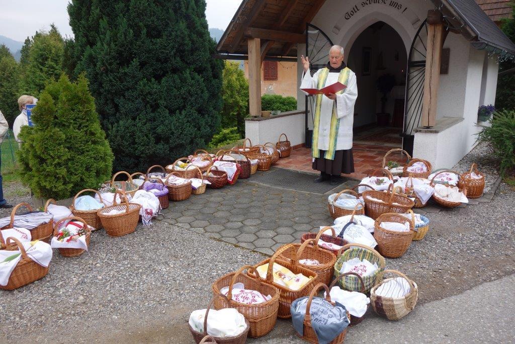 Die Osterspeisensegnung, volkstümlich auch "Fleischweihe" genannt, am Karsamstag ist ein schöner österlicher Brauch. Viele Gläubige aus der Stadtgemeinde Frohnleiten, aber auch aus den Nachbargemeinden, haben sich heute zur Segnung bei der Dorfkapelle in Schrauding mit Körben im Arm eingefunden. In denen befanden sich mit einem hübschen Tuch vor neugierigen Blicken geschützt, Osterfleisch, Ostereier, Osterbrot, Salz, Kräuter und natürlich auch Krenwurzeln. Die Segnung nahm heute Pater Simon um 9 Uhr vor.