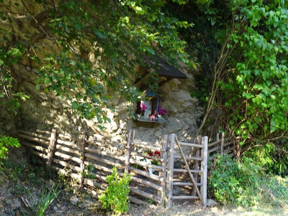 Über diesem Kleinod ist ein Holzdach zum Schutz gegen herabfallende Felsstücke angebracht und im Felsen verankert. Ein weiß blühender Fliederstrauch wurde vor dem Marterl gepflanzt und die Bäume über dem Felsen zur Sicherung belassen. Am Fuße des Felsens sind noch zwei große Blumentöpfe untergebracht. Umgeben ist dieses Juwel halbkreisförmig von einem Bänderzaun (ohne Nägel), eine typische Zaunform des steirischen Almenlandes, und einem hölzernen Eingangstor.