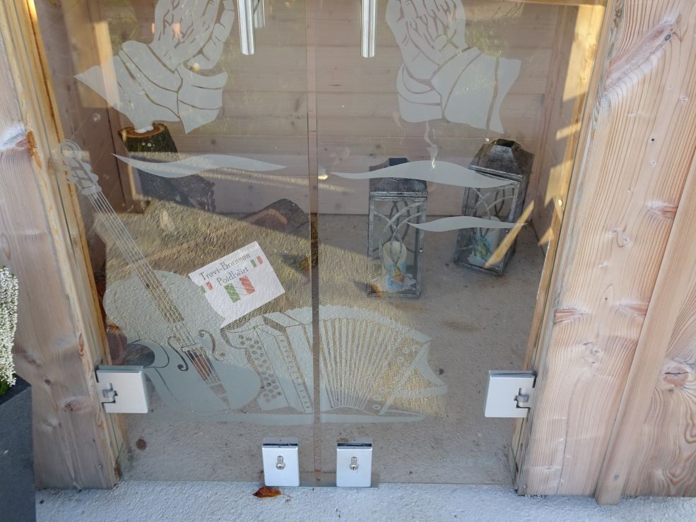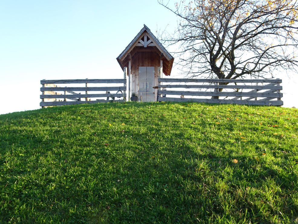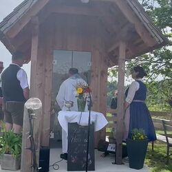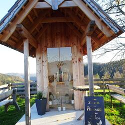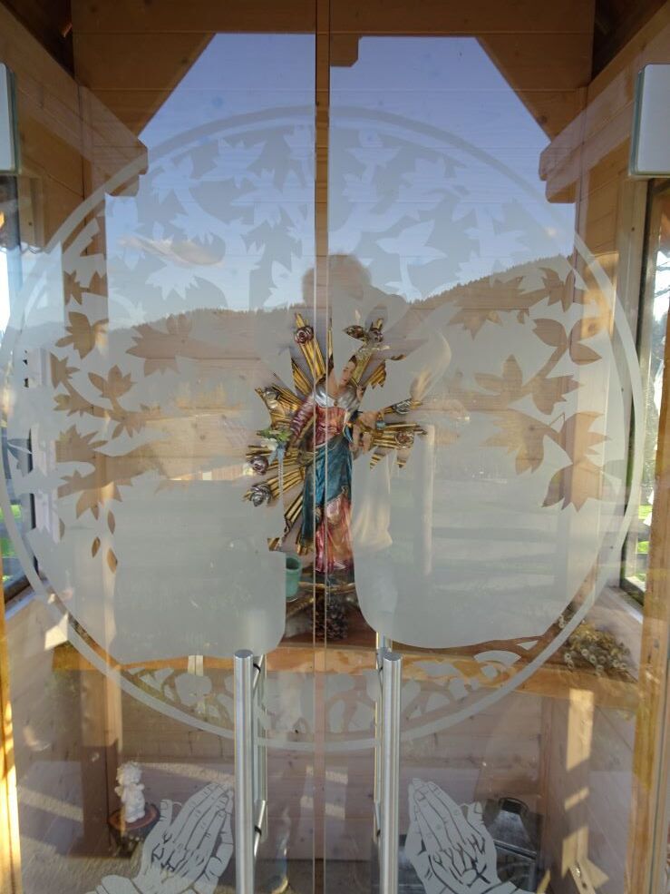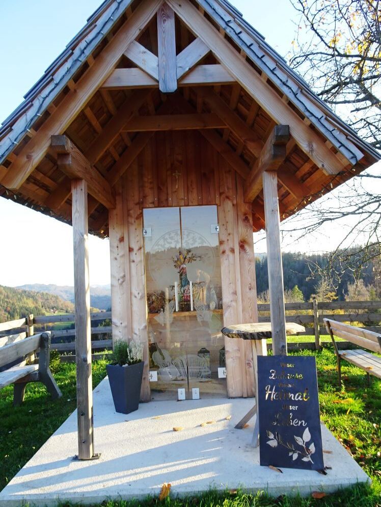 Man wollte mit dem gelungenen Kapellenbau einen kleinen Kraftplatz für die Familie schaffen, aber auch für die Öffentlichkeit zugänglich machen. Realisiert wurde das schöne Kleindenkmal in Eigenregie mit tollen Freunden und Nachbarn mit Lärchenholz aus eigenem Wald auf einem festen Betonfundament in unmittelbarer Nähe eines Kirschenbaums innerhalb eines halben Jahres. Die versperrbare Eingangstüre besteht aus Glas, worin die „Betenden Hände“ und zwei Musikinstrumente eingeätzt sind.