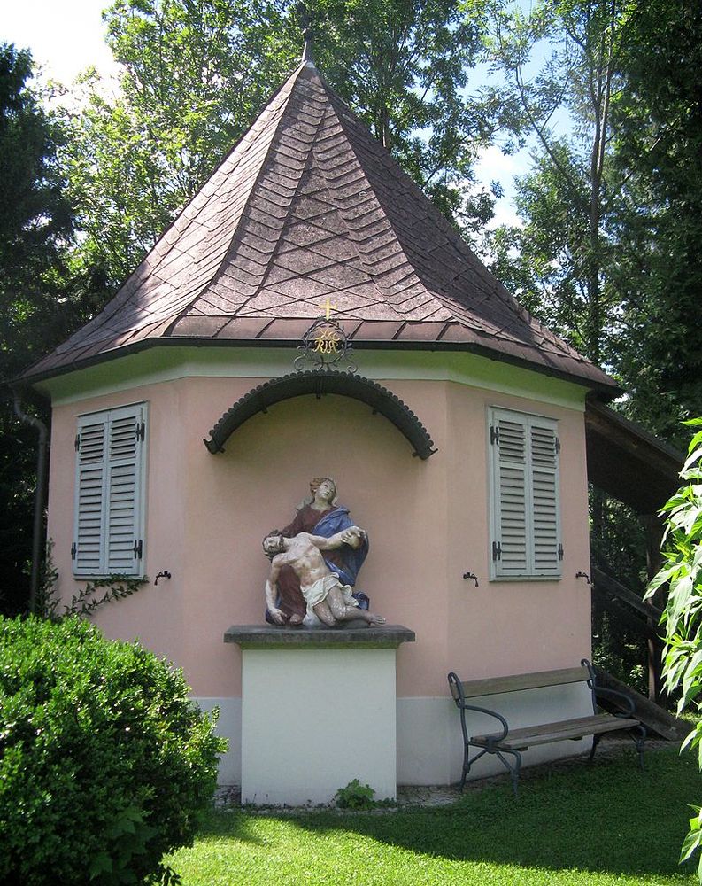 Eines der älteren Bilder unseres Klostergartens ist ein Gemälde im Servitenkloster zu Innsbruck, das die Filiale „Conventum divae V. Assumptae Fronleithi in Styria“, unser Kloster zeigt. Unser Wirtschaftsratsobmann Franz Koiner hat uns Fotos davon gemacht. Leider ist das Bild nicht datiert, das Vorhandensein des Dachreiters schränkt es aber zwischen 1683 (Fertigstellung des Turmes) und 1763 (Brand, nach dem er nicht mehr aufgebaut wurde) ein. Im Hintergrund sieht man die Gartenanlage, wie sie- leicht idealisiert- einem Barockgarten entspricht. Geometrisch angelegte Wege, das Lusthaus im Hintergrund und interessanterweise ein Obstgarten dort, wo jetzt alljährlich das Erntedankfest stattfindet. Wenn man in letzterem Bereich im Boden gräbt, findet man Unmengen von Ziegelschutt, der sicher sekundär dort abgelagert wurde, möglicherweise nach den verheerenden Bränden, die Frohnleiten mehrmals heimgesucht hatten. Ein paar Dinge fallen noch auf: Die Mauer, die den ganzen Garten umgab, später jedoch (siehe Franziszeischer Kataster 1820-1825) nur mehr den Gemüsegarten und das Glashaus in seiner jetzigen Form einschloss. Weiters ist kein Brunnen eingezeichnet, was recht ungewöhnlich ist für eine Zeit, in der Wasserleitungen zur Versorgung noch nicht existierten.