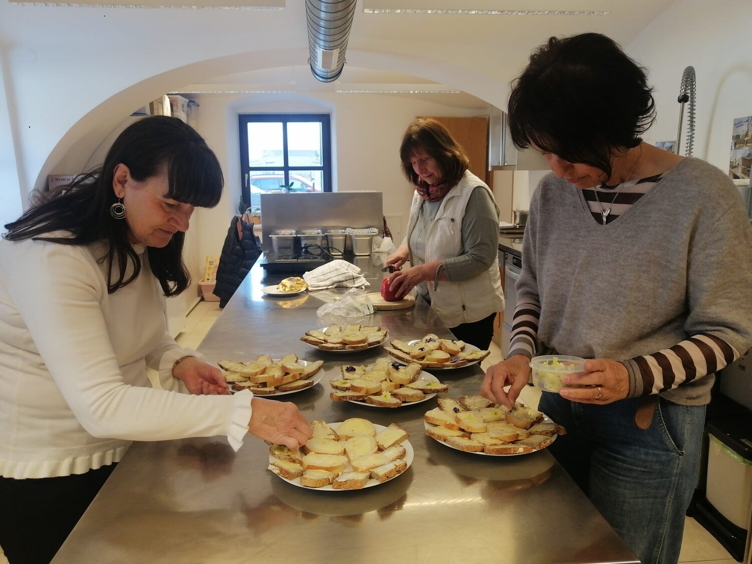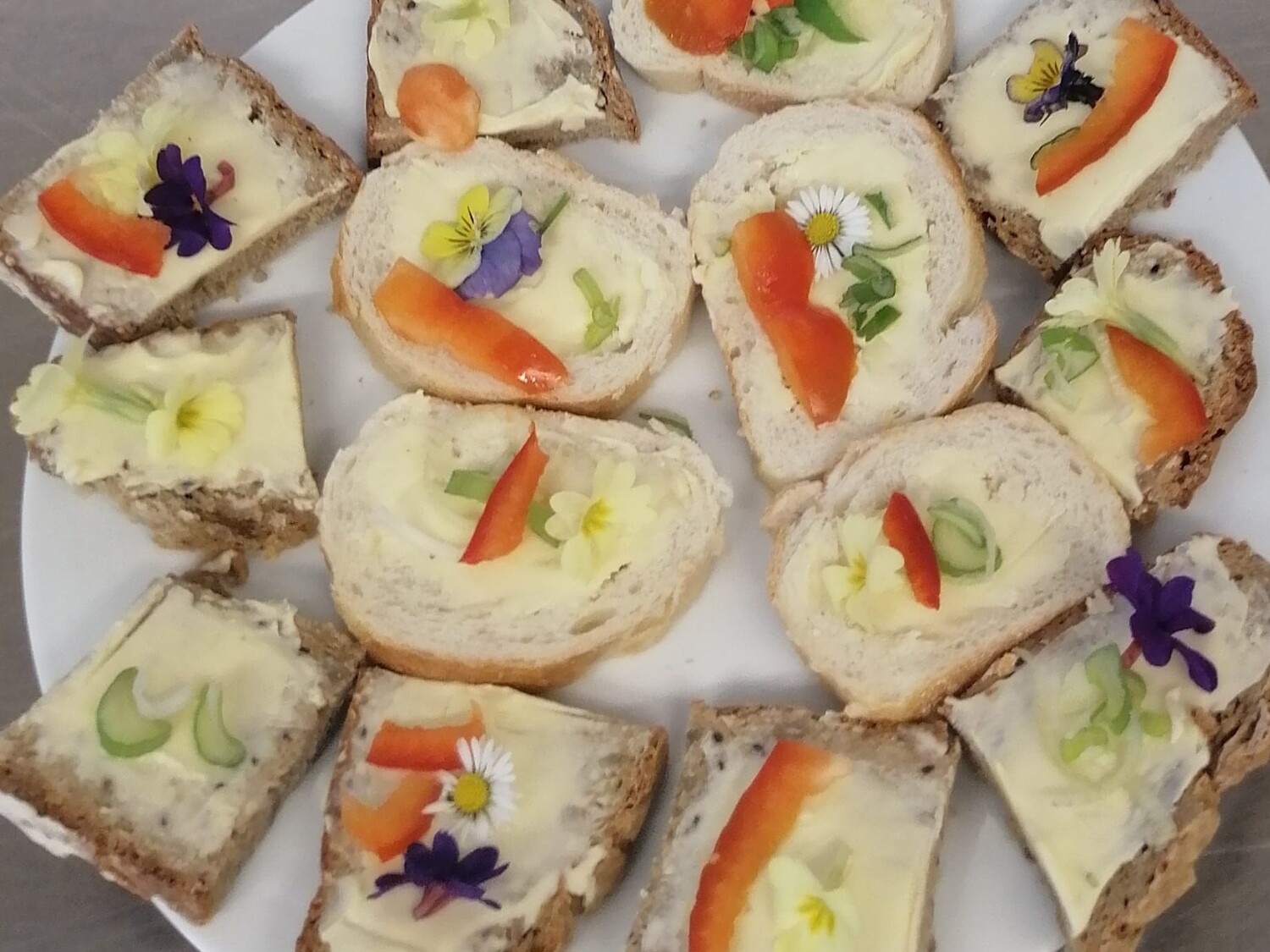 Viele schöne Gespräche und Begegnungen folgten bei guter Ver­pfle­gung. Be­son­ders ap­pe­tit­lich waren die Butter­brote aus selbst ge­back­en­em Schwarz­brot - bunt ver­ziert mit den ers­ten Blüten aus Gerti´s Garten. Auch ein Glaserl Wein durfte nicht fehlen und so fand der Nach­mittag einen ge­müt­lichen Aus­klang.