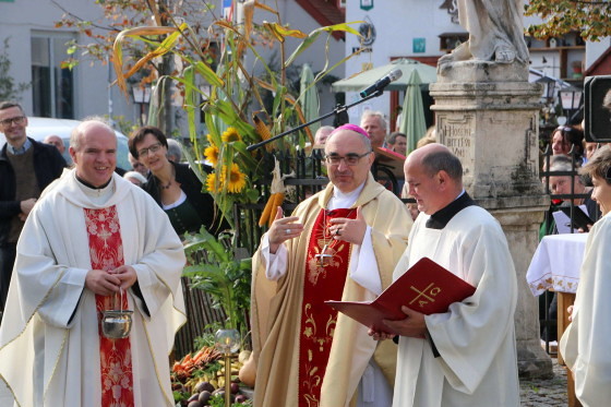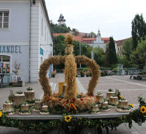 Am Sonntag, den 29. September 2019, feierte die Pfarre Graz-Mariahilf gemeinsam mit den Weinrittern, dem Grazer Bürgerkorps und den marktbeschickenden Bauern bei Sonnenschein ihr Erntedankfest bei der Marienstatue am Lendplatz. Hauptzelebrant und Festprediger des feierlichen Gottesdienstes war Diözesanbischof Dr. Wilhelm Krautwaschl. Am Ende des Erntedankgottesdienstes wurden auch die 13 neuen Glockenspielglocken, die das Mariahilfer Glockenspiel vervollständigen sollen, von Bischof Wilhelm geweiht.