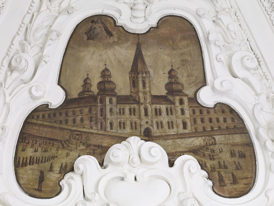 Die Wölbung in Form einer Tonne, in die über den Fenstern tiefe Stichkappen einschneiden, ist mit zartem weißen Stuck im Régence-Stil geschmückt. Er zeigt neben reicher Bandwerkornamentik Putten mit kirchlichen Insignien und Geräten. Der um 1739 entstandene Gewölbeschmuck wird Johann Cajetan Androy († 1755) zugeschrieben, der u. a. auch für das steirische Stift St. Lambrecht tätig war. Derselben Epoche entstammen die mit feinen Intarsienarbeiten geschmückten Sakristeischränke, die in die Jahre zwischen 1740 und 1750 datiert werden. Die beiden Schränke an der Südwand entstanden erst 1770.