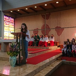 Maria Pitsch und Tina Schörgi stellten zwei starke Frauen in der Predigt vor. Die Heilige Maria und Edith Stein, die lange Zeit ihren Weg und den Glauben suchte und nach ihrer Berufung als Heilige Theresia Benedicta vom Kreuz in den Karmelitinnenorden eintrat. Sie wurde 1942 in Auschwitz ermordet.