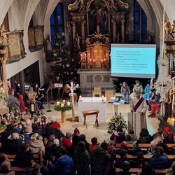 Schon beim Ankommen in der Kirche erklangen viele schöne Weihnachtslieder, die zum Mitsingen einluden und auf die Feier einstimmten. In kindgerechter Erzählweise, mit schönen Bildern untermalt, wurde dann die Botschaft von der Geburt Jesu in unsere Wirklichkeit geholt.