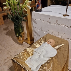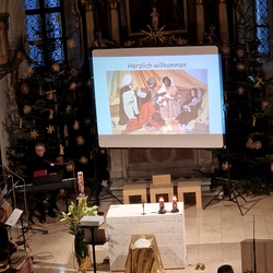 In seiner Predigt sprach Vikar Gerhard von Gott, der als kleines, hilfloses Kind zur Welt gekommen ist, in Armut und Bedürftigkeit. Eine mitgebrachte Windel symbolisiert dies. - Gott ist einer von uns, er kommt uns entgegen. Er ist ein Gott, an den wir uns anlehnen können. Er umarmt uns und stillt unser Verlangen nach Geborgenheit, Liebe und Frieden. …