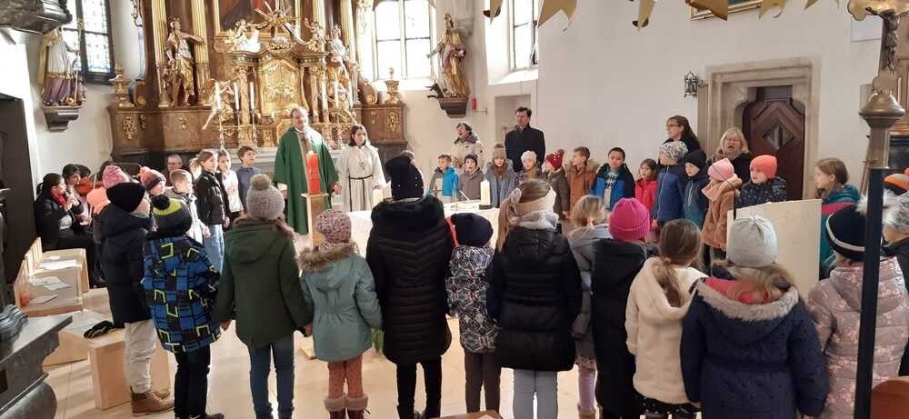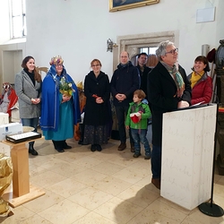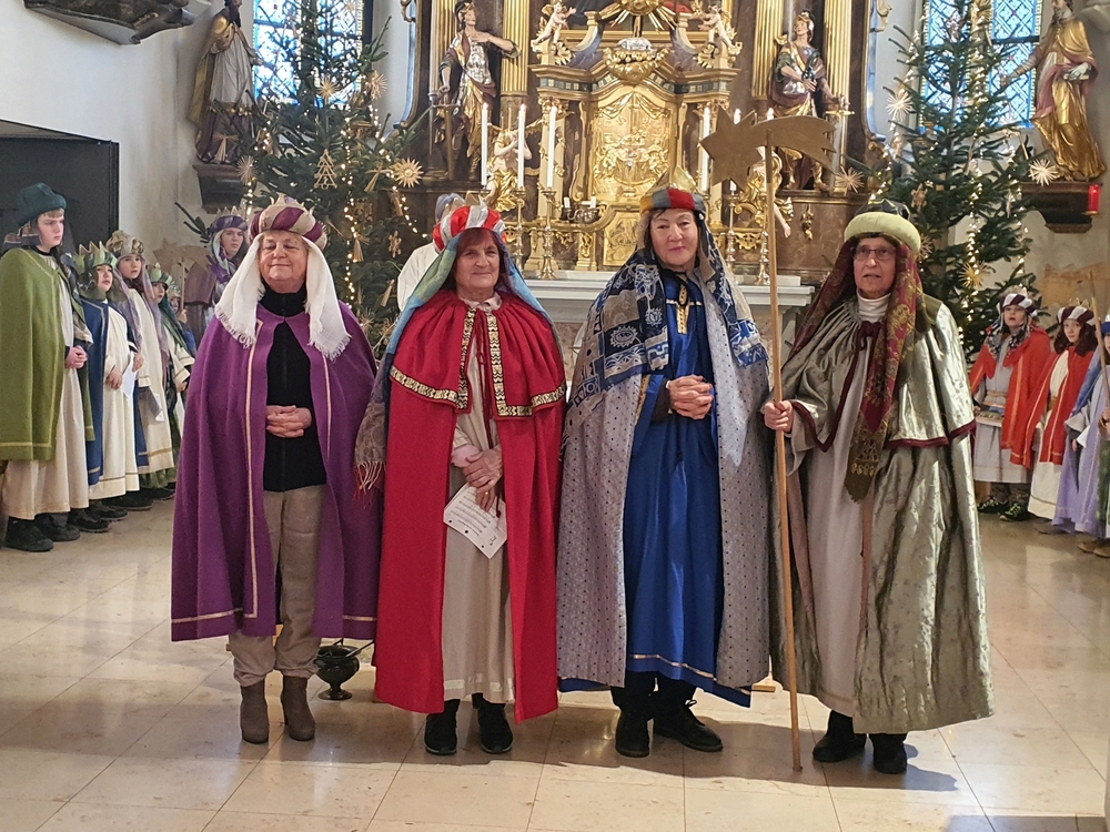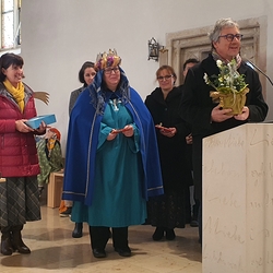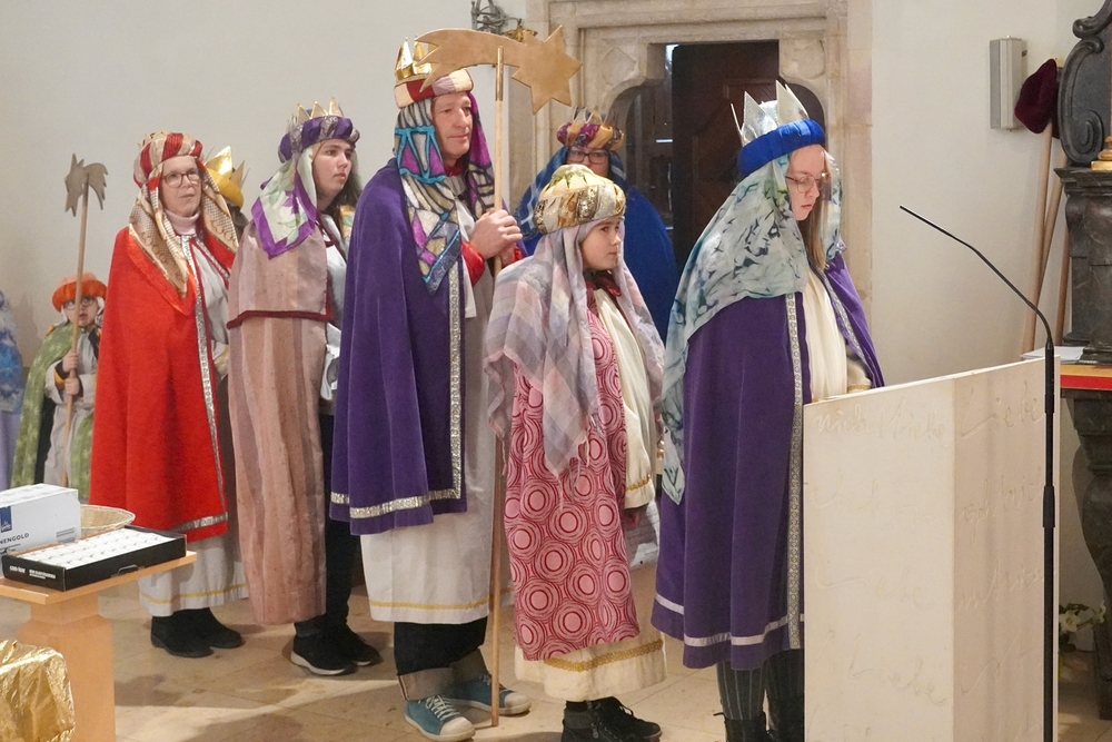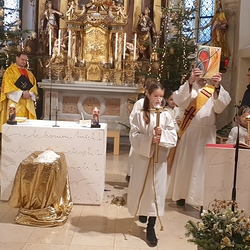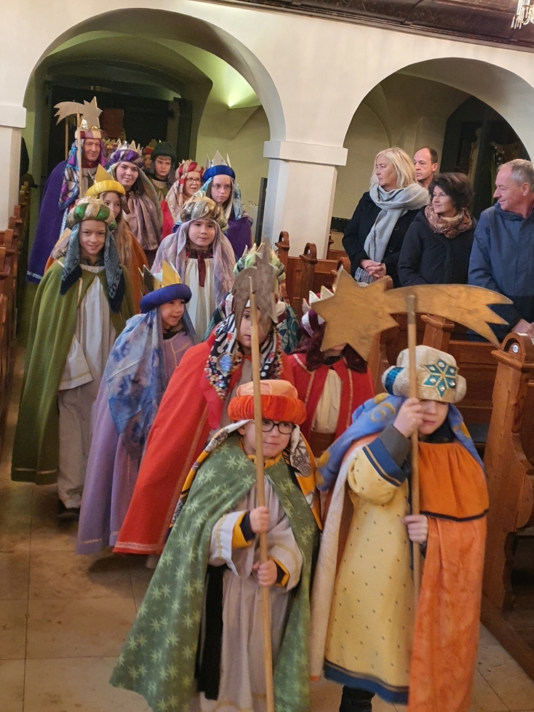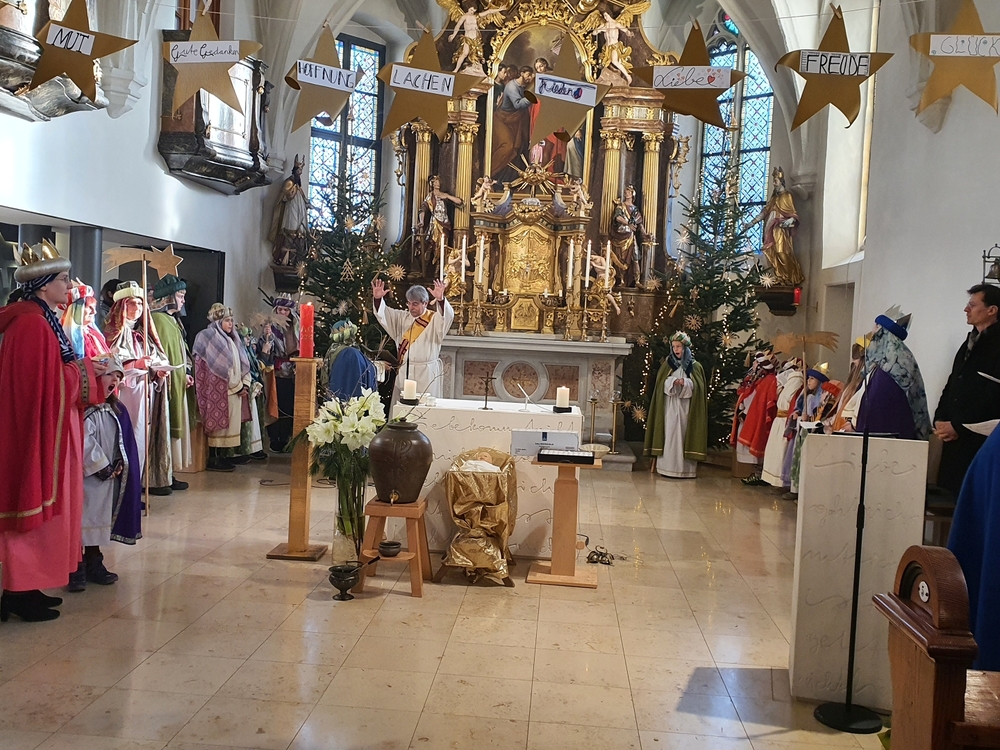 Mit einem königlichen Einzug begann der Sternsingergottesdienst am Dreikönigstag. Diakon Michi Zepf zelebrierte die Wort-Gottes-Feier mit Kommunionspendung zum „Hochfest der Erscheinung des Herrn“. In vielen Texten und Liedern kam das Anliegen der Dreikönigsaktion zum Ausdruck. Noch einmal trat eine Sternsingergruppe auf und präsentierte ihre Botschaft. Die Segnung des Dreikönigswassers und des Salzes, das auch zum Mitnehmen angeboten wurde,  bildete zusammen mit der Allerheiligenlitanei, vorgetragen von Martin Kirchberger, den feierlichen Abschluss der WGF.
