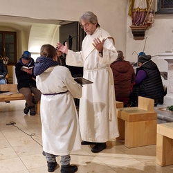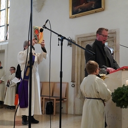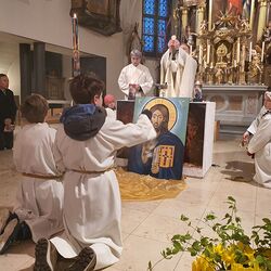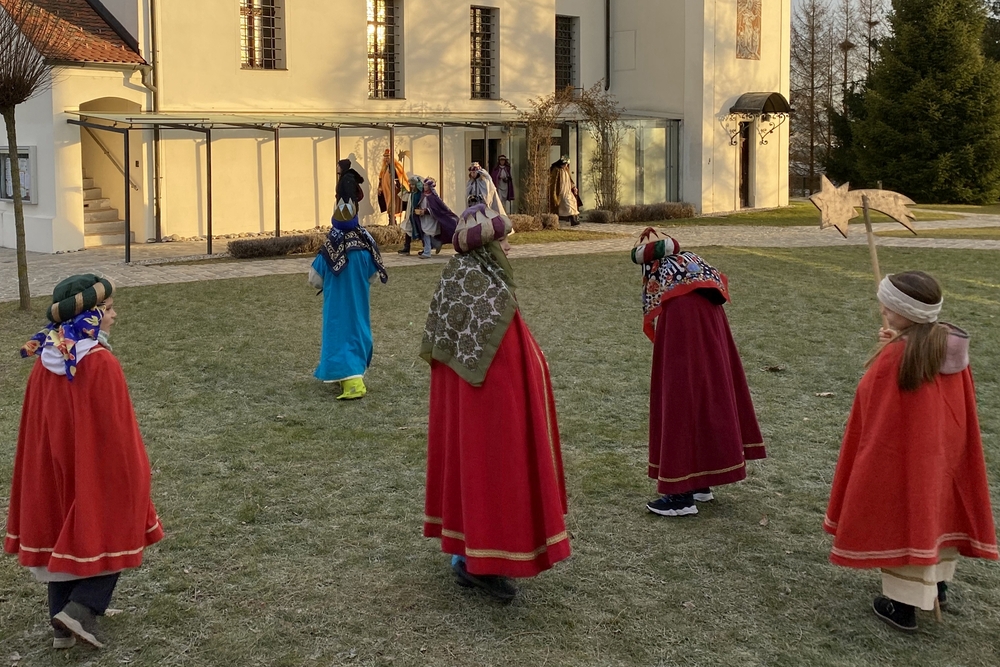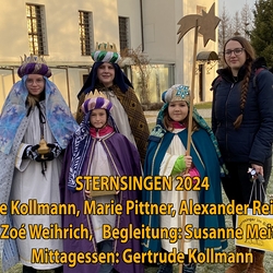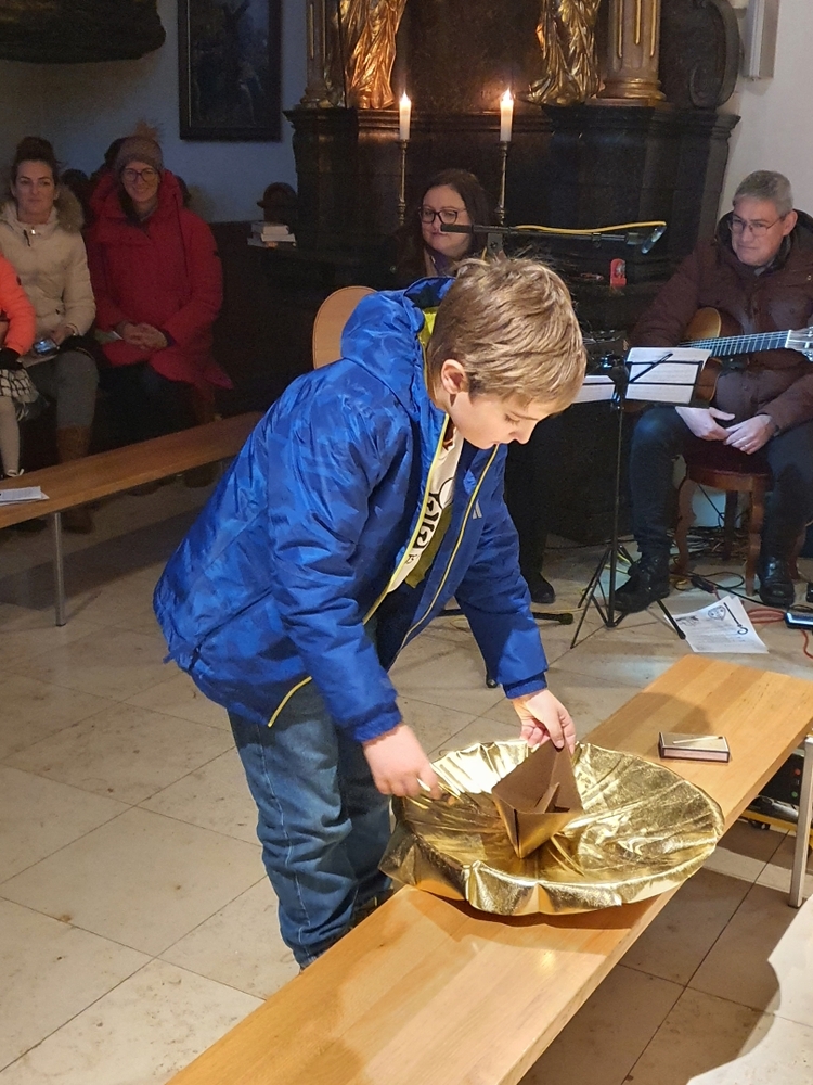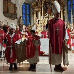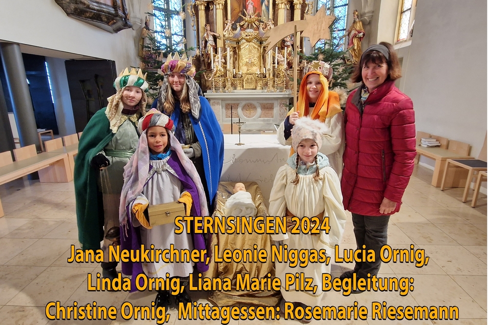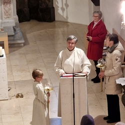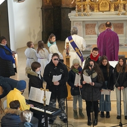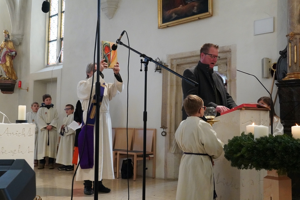 Mit einem königlichen Einzug begann der Sternsingergottesdienst am Dreikönigstag. Diakon Michi Zepf zelebrierte die Wort-Gottes-Feier mit Kommunionspendung zum „Hochfest der Erscheinung des Herrn“. In vielen Texten und Liedern kam das Anliegen der Dreikönigsaktion zum Ausdruck. Noch einmal trat eine Sternsingergruppe auf und präsentierte ihre Botschaft. Die Segnung des Dreikönigswassers und des Salzes, das auch zum Mitnehmen angeboten wurde,  bildete zusammen mit der Allerheiligenlitanei, vorgetragen von Martin Kirchberger, den feierlichen Abschluss der WGF.