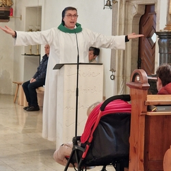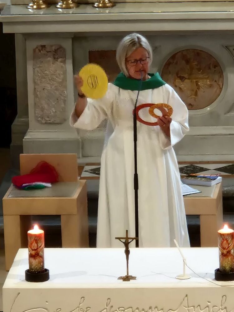 Sehr anschaulich erläuterte Helga mit einem Symbol das Wesen des dreieinen Gottes und brachte in der Predigt ihre Gedanken zur „Dreifaltigkeit“ zum Ausdruck: