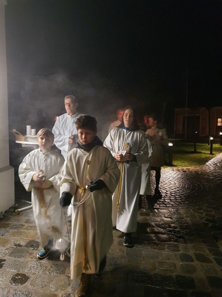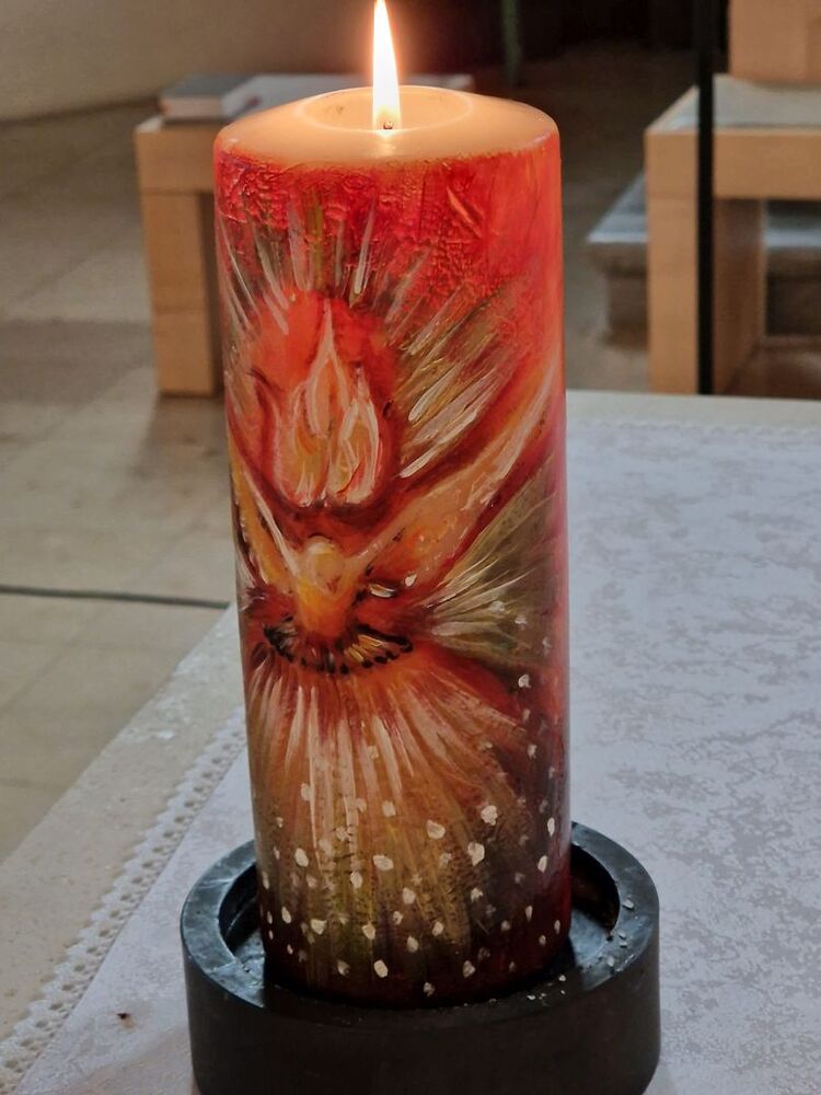 Noch einmal wurden – wie schon am Friedhof – die Namen der Verstorbenen von Allerheiligen 2022 bis Allerheiligen 2023 vorgelesen. 43 Teelichter wurden entzündet, eines davon für alle nicht namentlich genannten Verstorbenen.